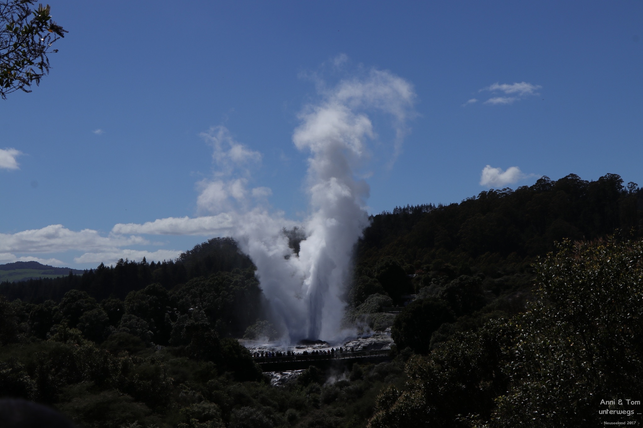 Wir starten mit einer Führung, die von einem Maori durchgeführt wird, bevor es dann zu einer kulturellen Show, mit Vorführung des berühmten Haka, geht. Danach erkunden wir Te Piua noch auf eigene Faust und hoffen, dass der Pohutu Geysir erneut richtig hoch Wasser spuckt, was aber leider nicht passiert.