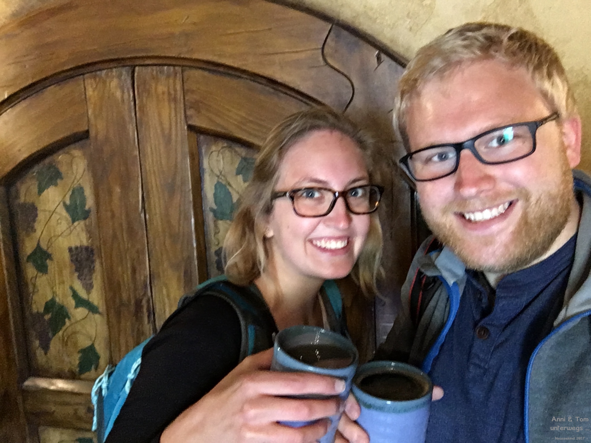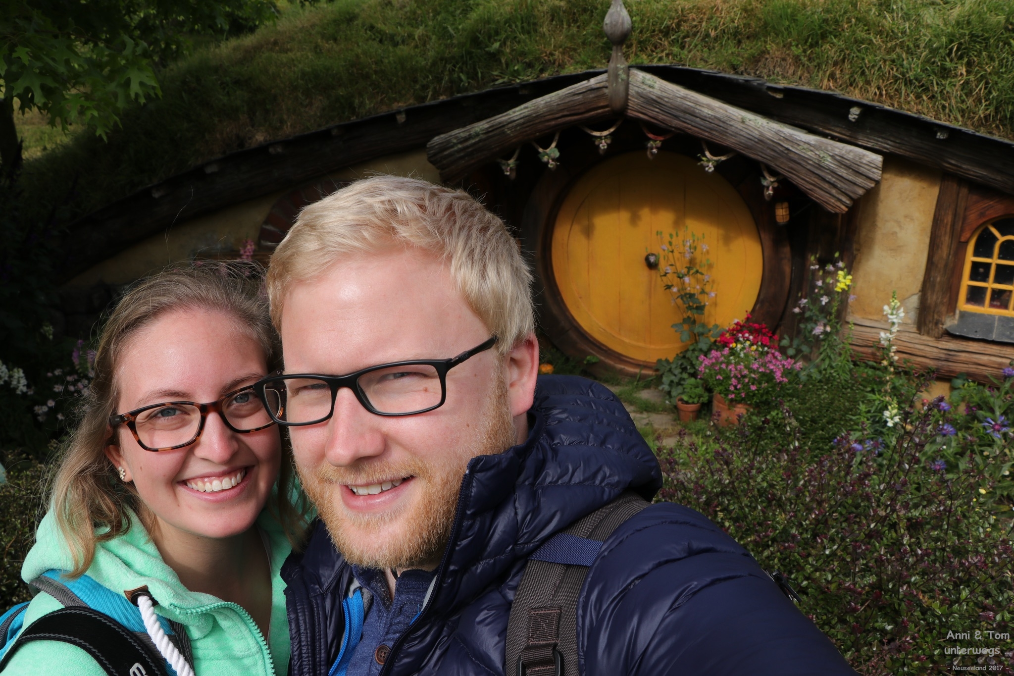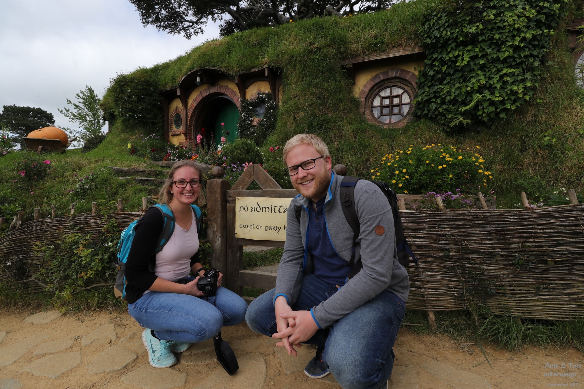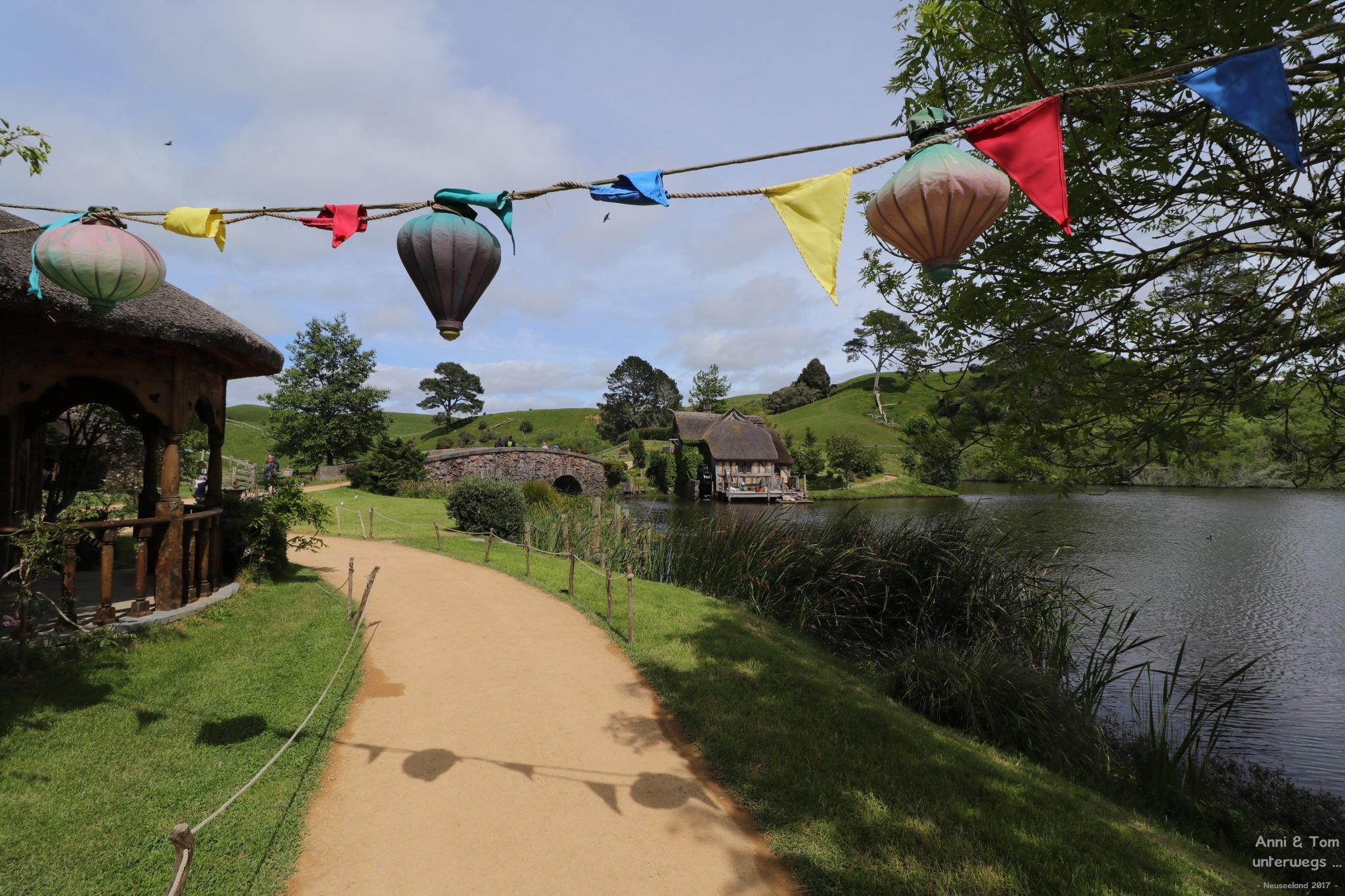Da wir bereits die erste Tour morgens um 09:00 Uhr gebucht haben, machen wir uns zeitig auf den Weg nach Hobbiton. Dort angekommen, werden wir mit einem Bus an das Filmset gebracht. Auf unserem Weg zu Fuß durch Hobbiton werden zahlreiche Fotos von den verschiedenen Hobbithöhlen, Gärten, Hügeln, Bäumen, Wäscheleinen, Seen und vielem mehr gemacht. Wir kommen gar nicht mehr aus dem Staunen heraus :-) Das ganze Set macht direkt wieder Lust in die Filme einzutauchen!
