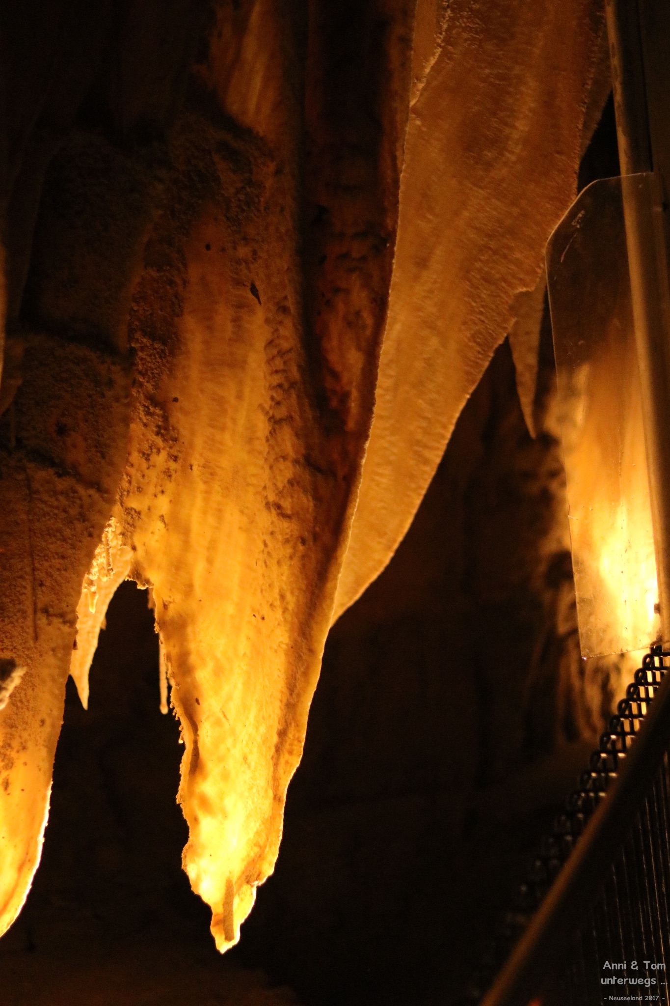 Heute Morgen machen wir uns auf den Weg zu den Glühwürmchen. Diese befinden sich in einer Tropfsteinhöhle, welche bereits 1889 entdeckt wurde. Mit einer Führung durch die Stalaktiten und Stalagmiten erkunden wir die Höhle, bevor es mit dem Boot weiter zu den Glühwürmchen geht. Ganz im Dunkeln schippern wir unter ihnen durch, es sind bestimmt tausende über uns zu sehen.