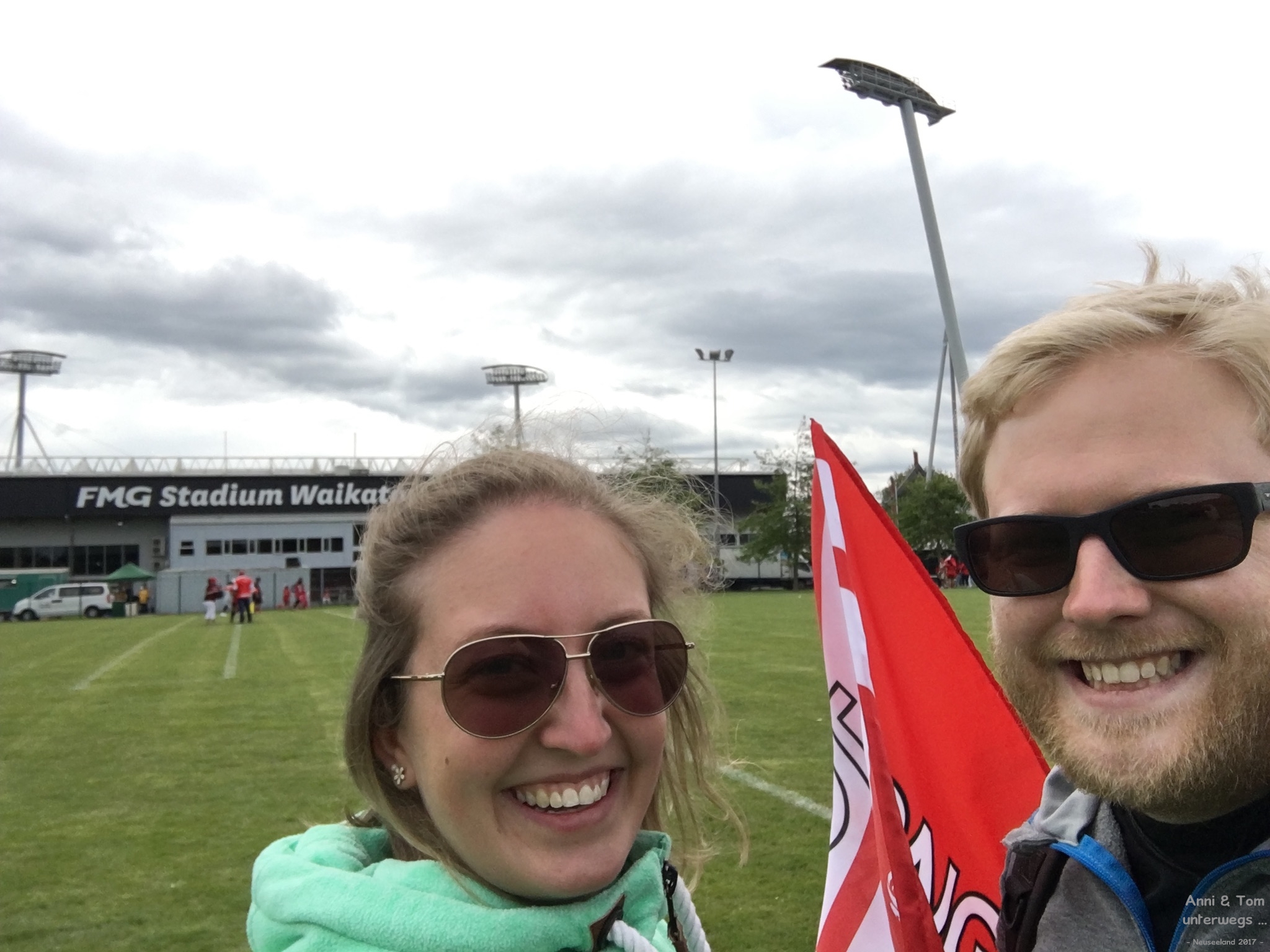 Nach den Höhlenbesichtigungen geht es weiter Richtung Hamilton. Dort haben wir Tickets für das Rugby Spiel Neuseeland gegen Tonga, der Rugby League Weltmeisterschaft 2017. Von netten Tongafans bekommen wir eine Fahne geschenkt. Mit unserem neuen Fanaccessoire machen wir uns nun auf den Weg ins Stadion. Bevor das Spiel beginnt demonstrieren beide Mannschaften dem jeweiligen Gegner ihre Stärke durch einen traditionellen Haka. :-)