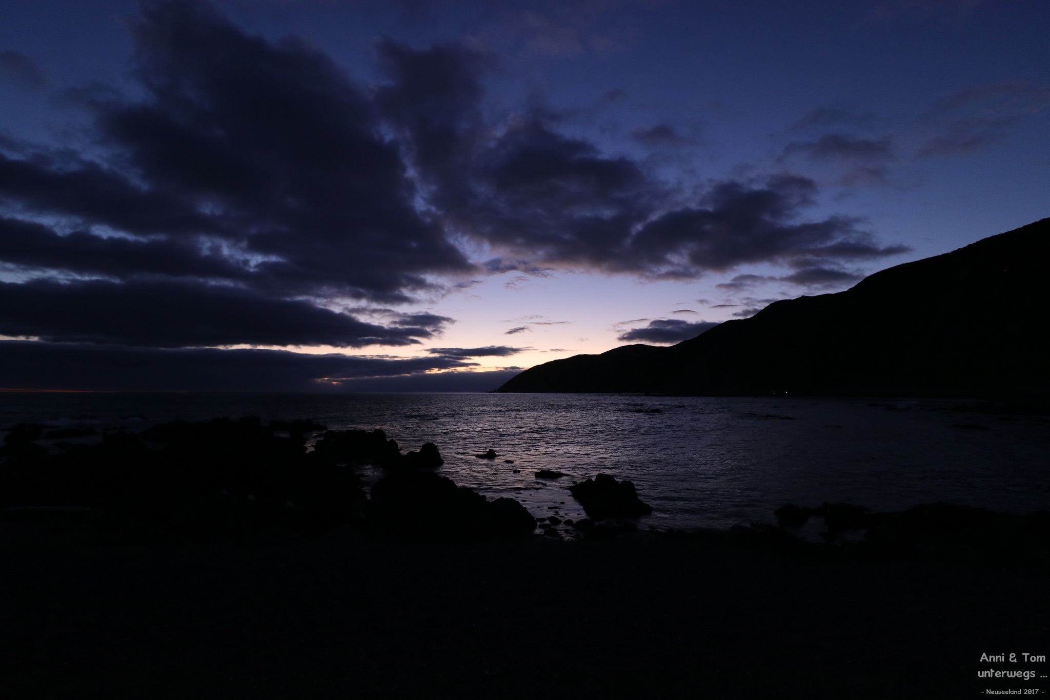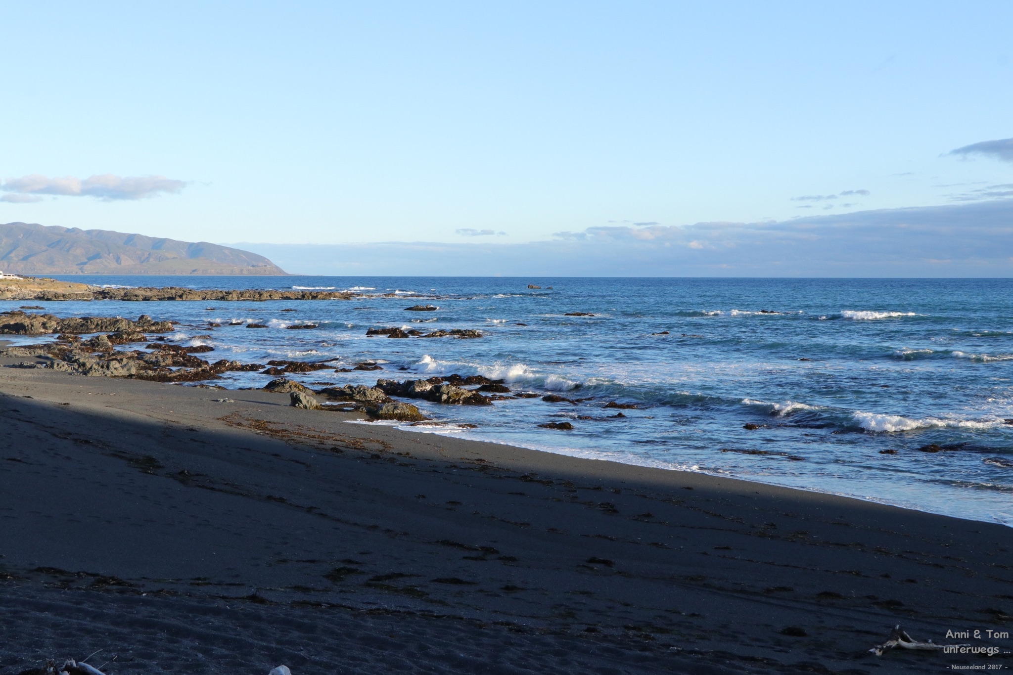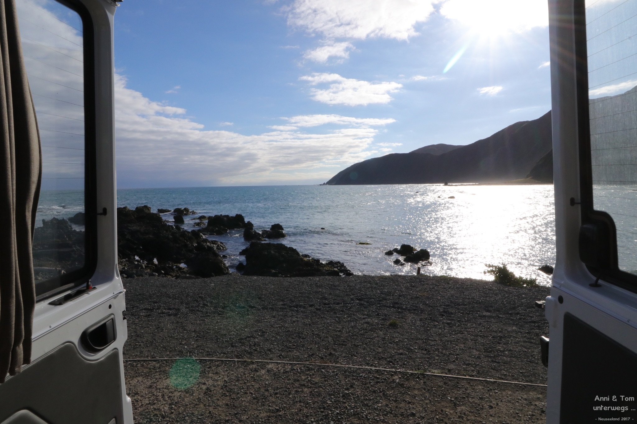In Wellington angekommen ergattern wir den letzten freien Stellplatz auf einem Campingplatz direkt am Pazifik :-)