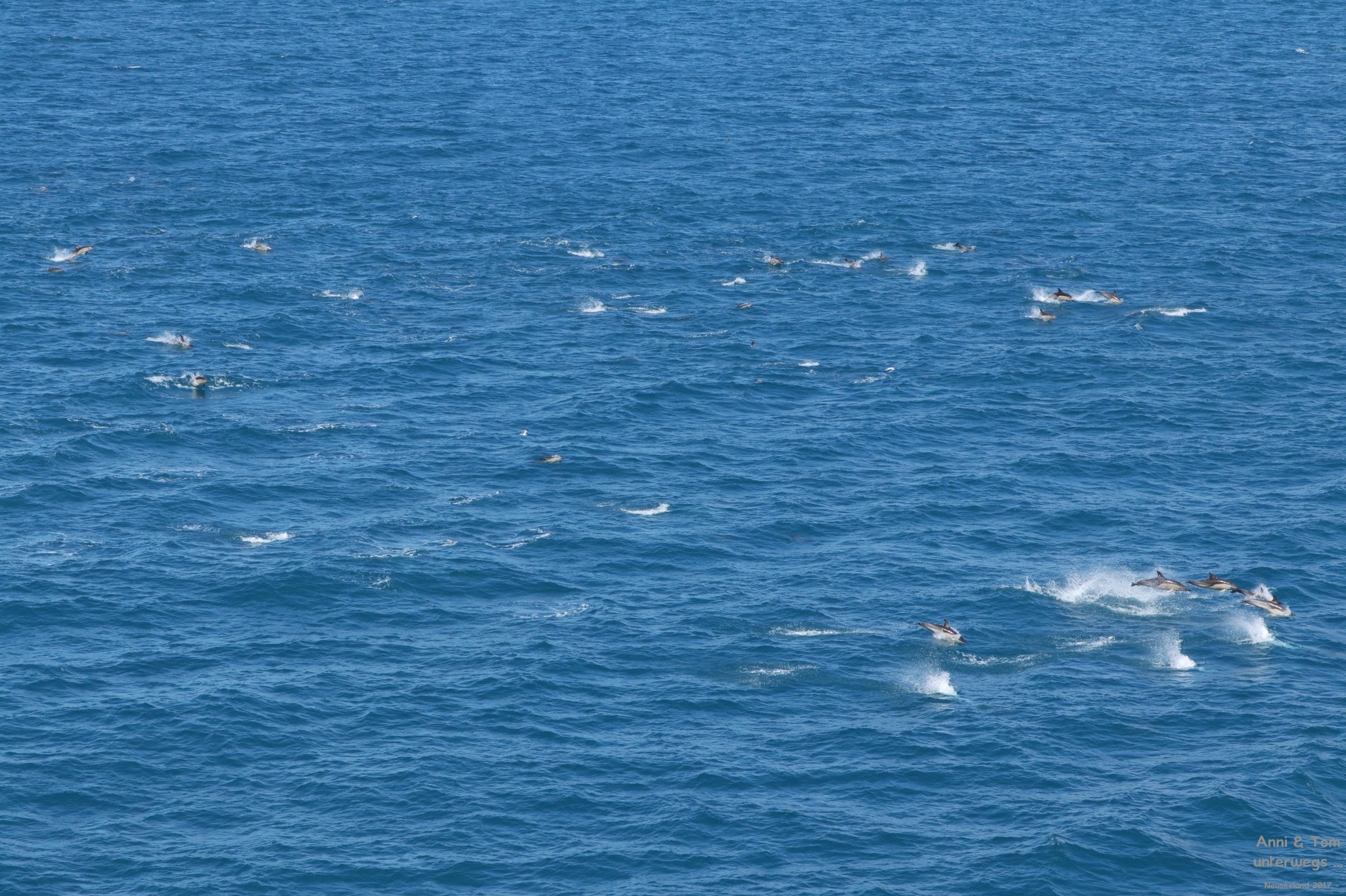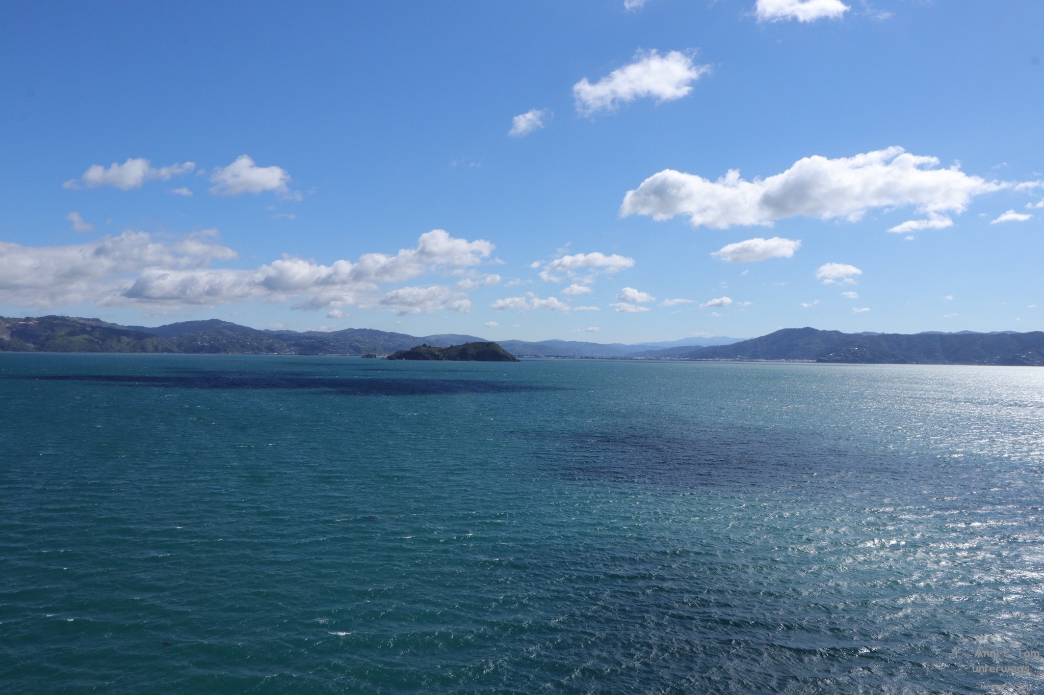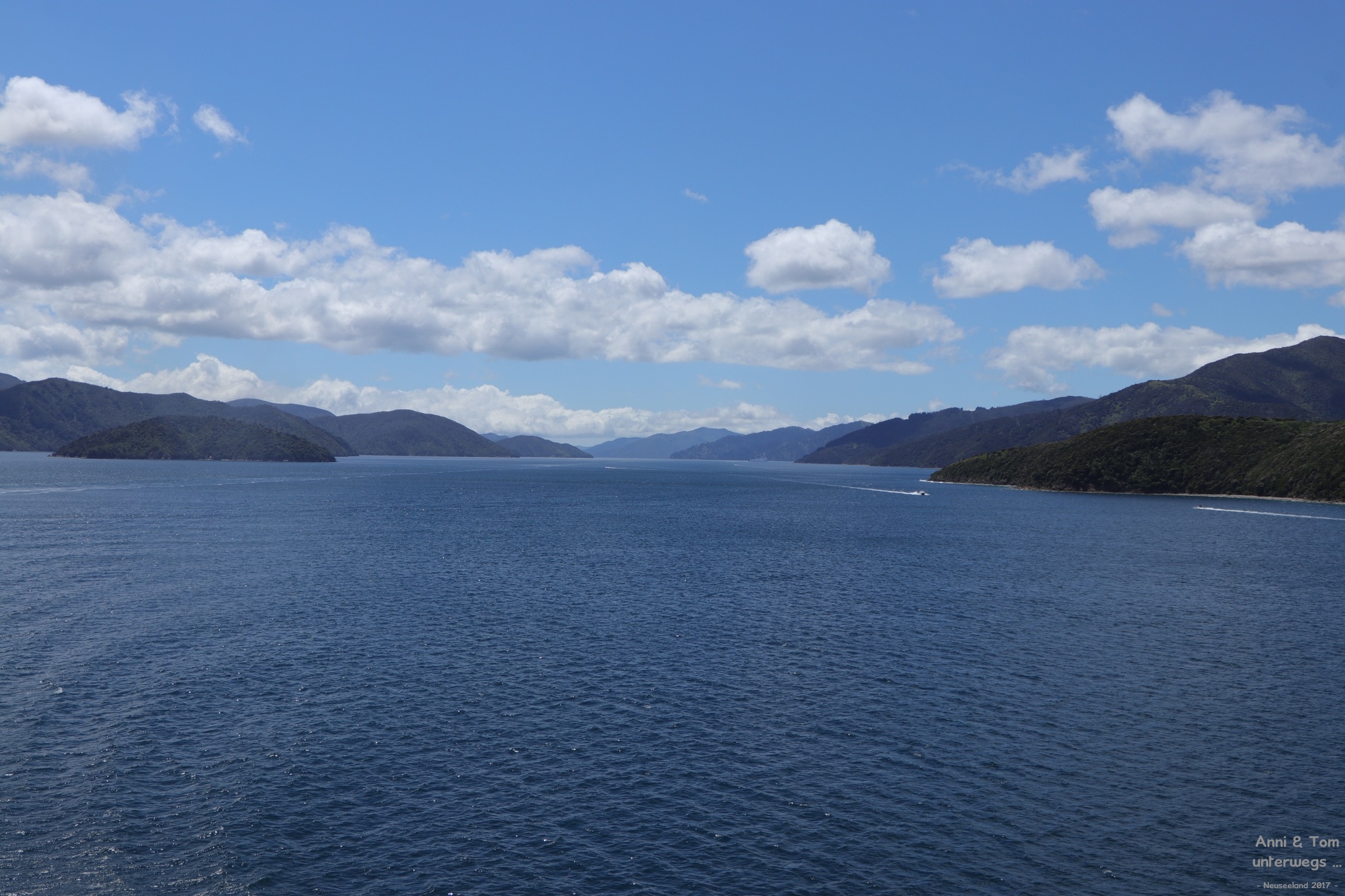 Die Überfahrt ist zwar sehr windig, da wir uns aber Sonnenplätze ergattern konnten, genießen wir die frische Luft an Deck. Glücklicherweise zeigt sich uns, vor der Einfahrt in die Fjorde der Südinsel, eine große Delfinschule :-)