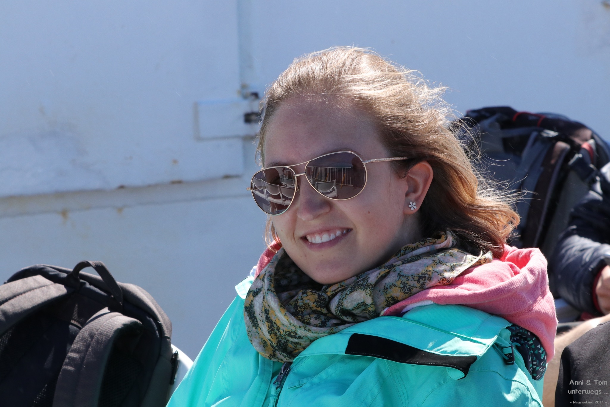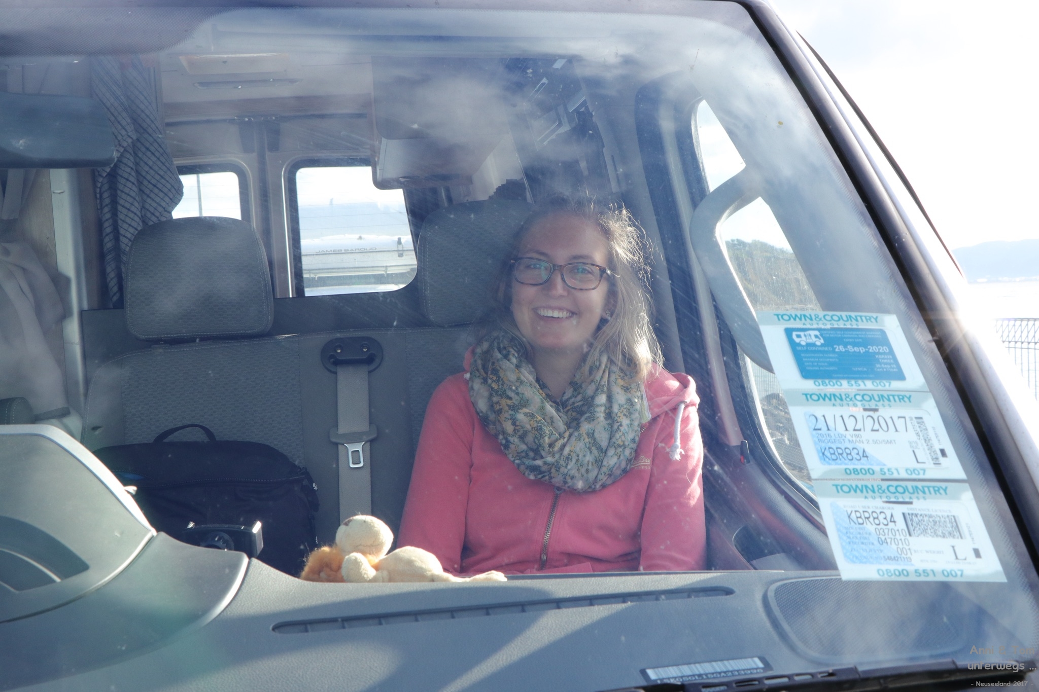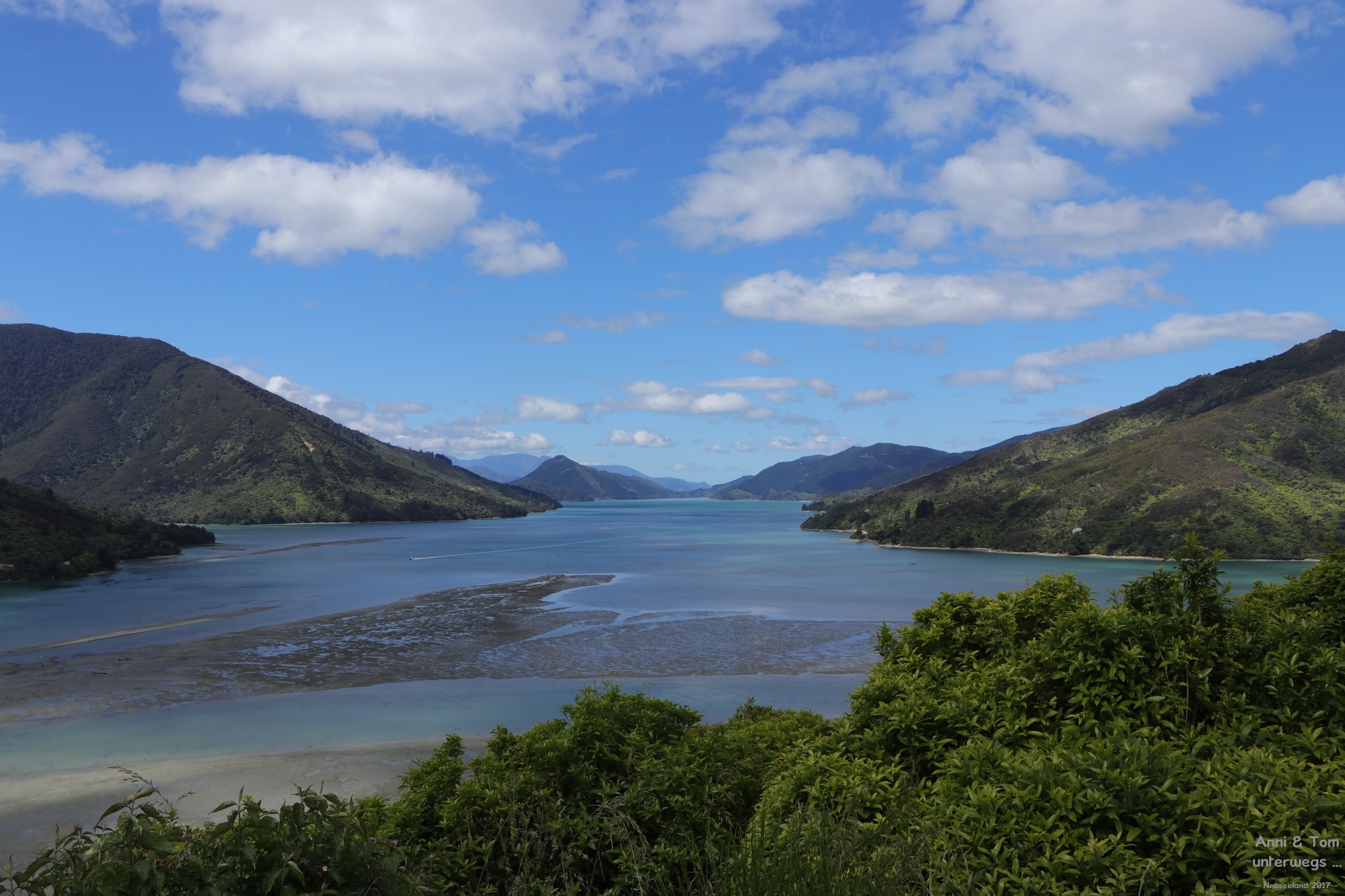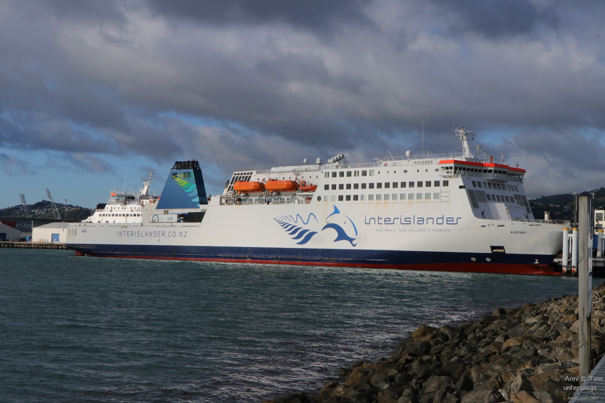 Die Überfahrt ist zwar sehr windig, da wir uns aber Sonnenplätze ergattern konnten, genießen wir die frische Luft an Deck. Glücklicherweise zeigt sich uns, vor der Einfahrt in die Fjorde der Südinsel, eine große Delfinschule :-)