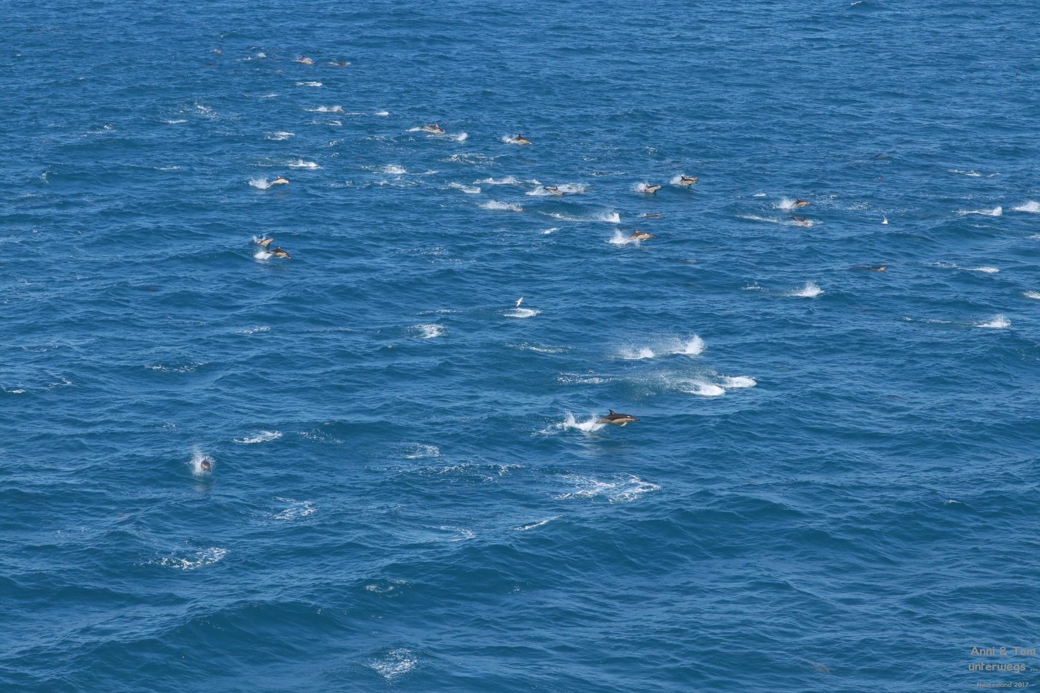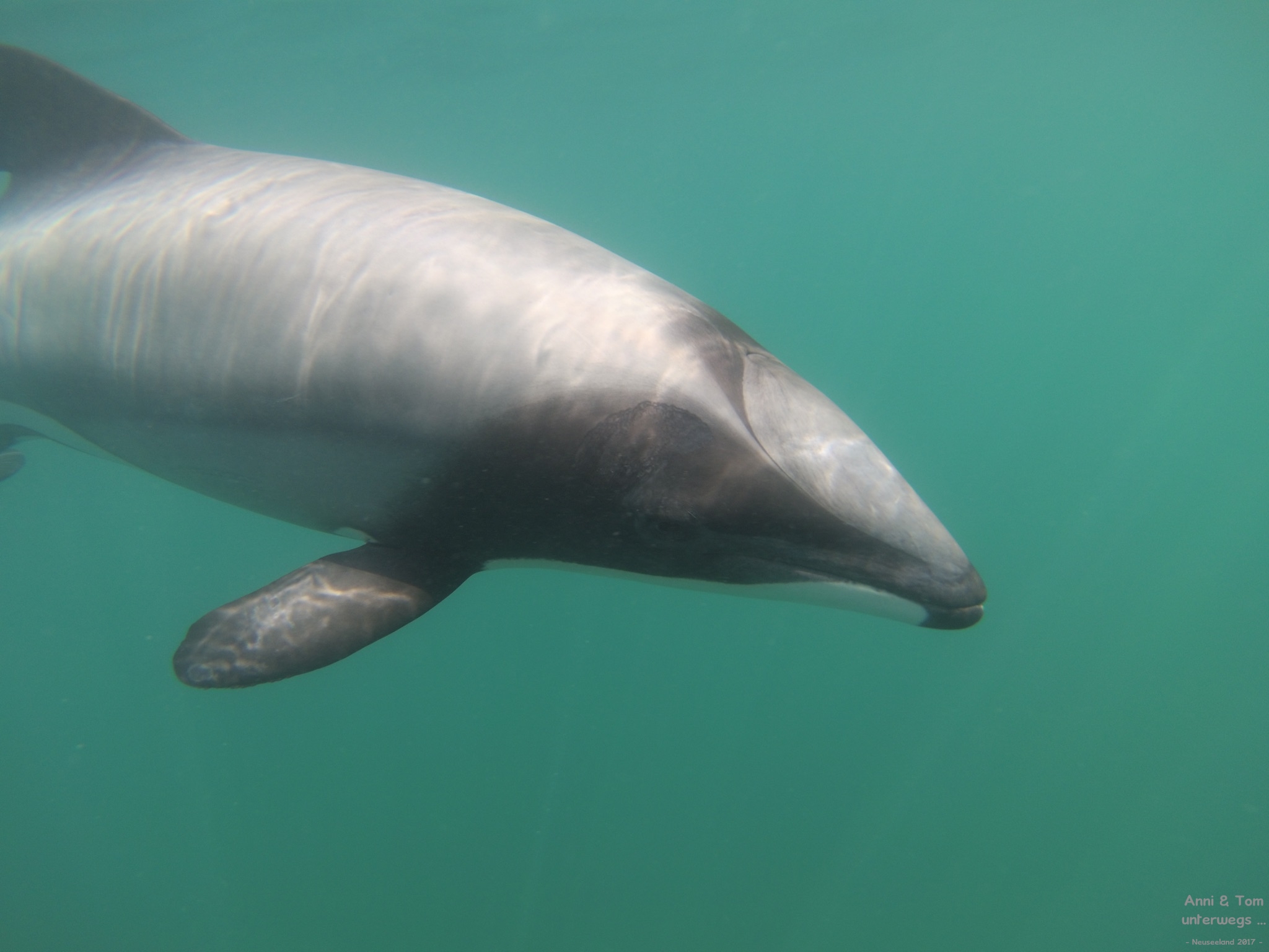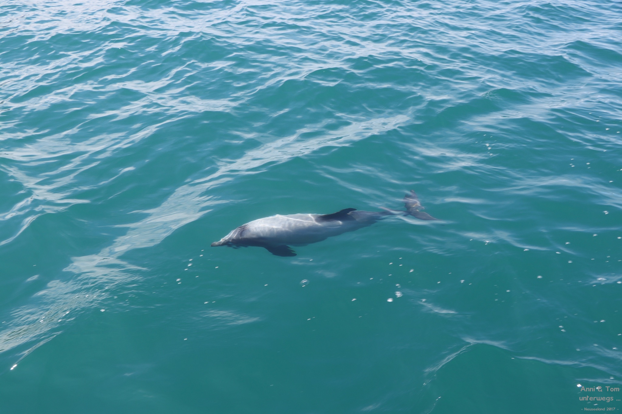 Auf dem offenen Meer angekommen, begegnen uns drei Hector-Delfine (auch Neuseeland-Delfine genannt). Dies ist die kleinste Delfinart der Welt, die Tiere werden nur 120 cm groß.
