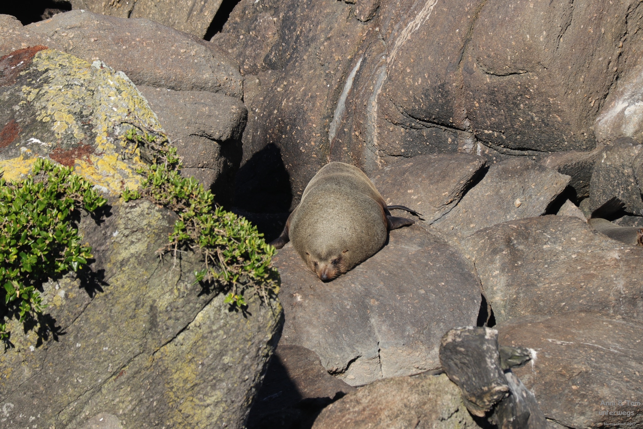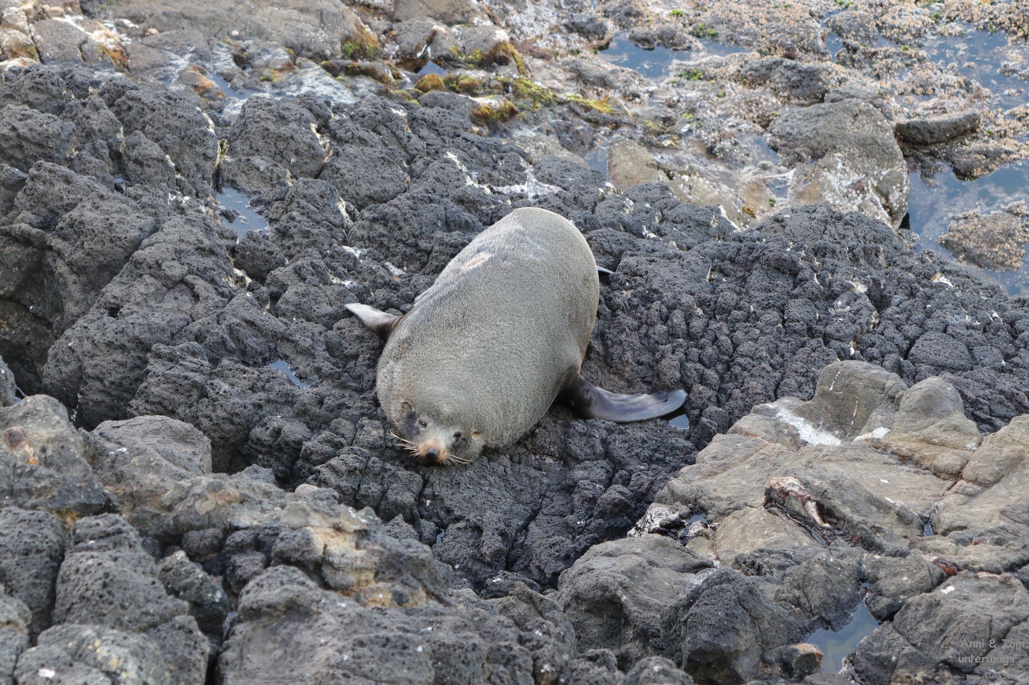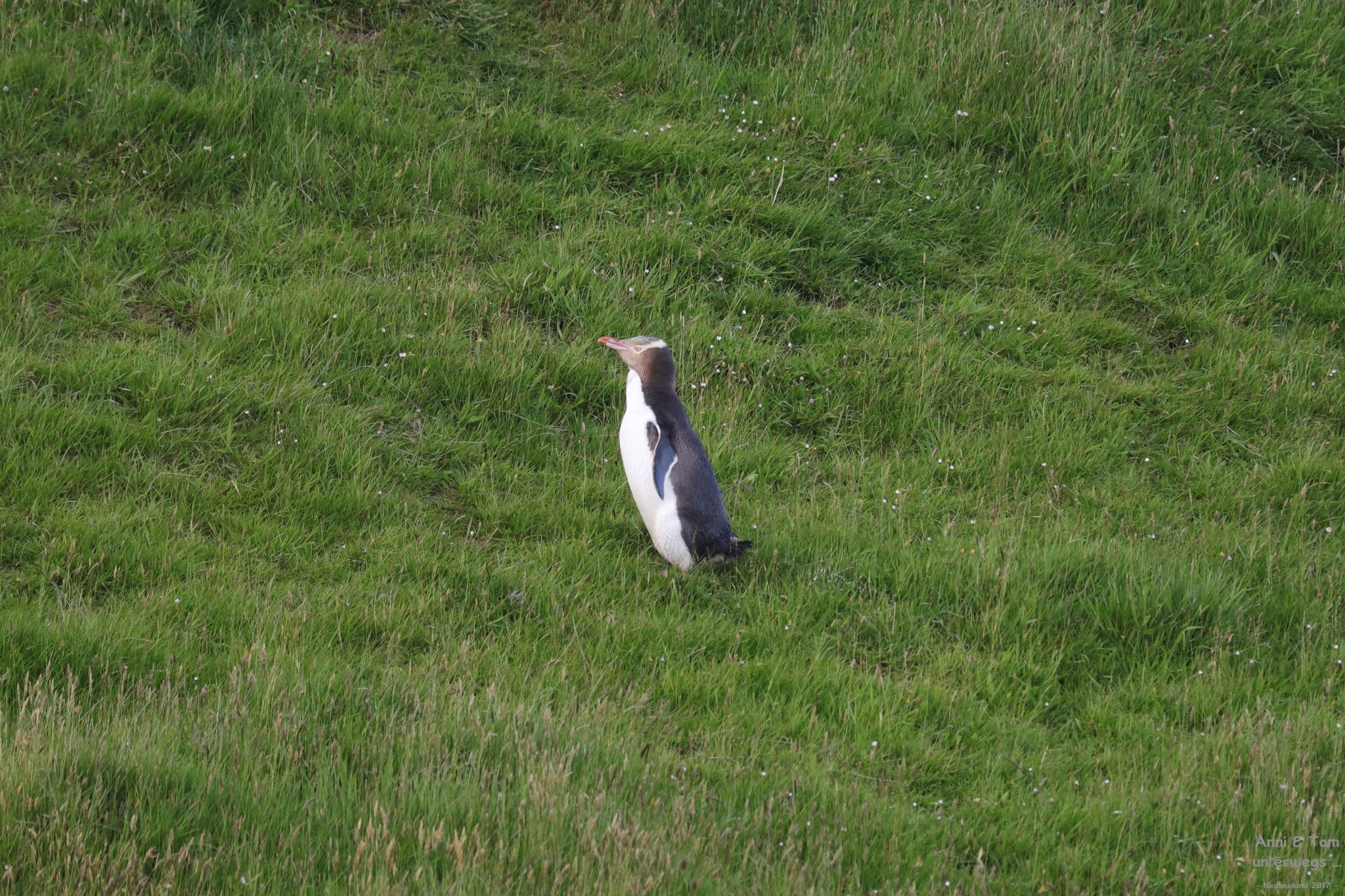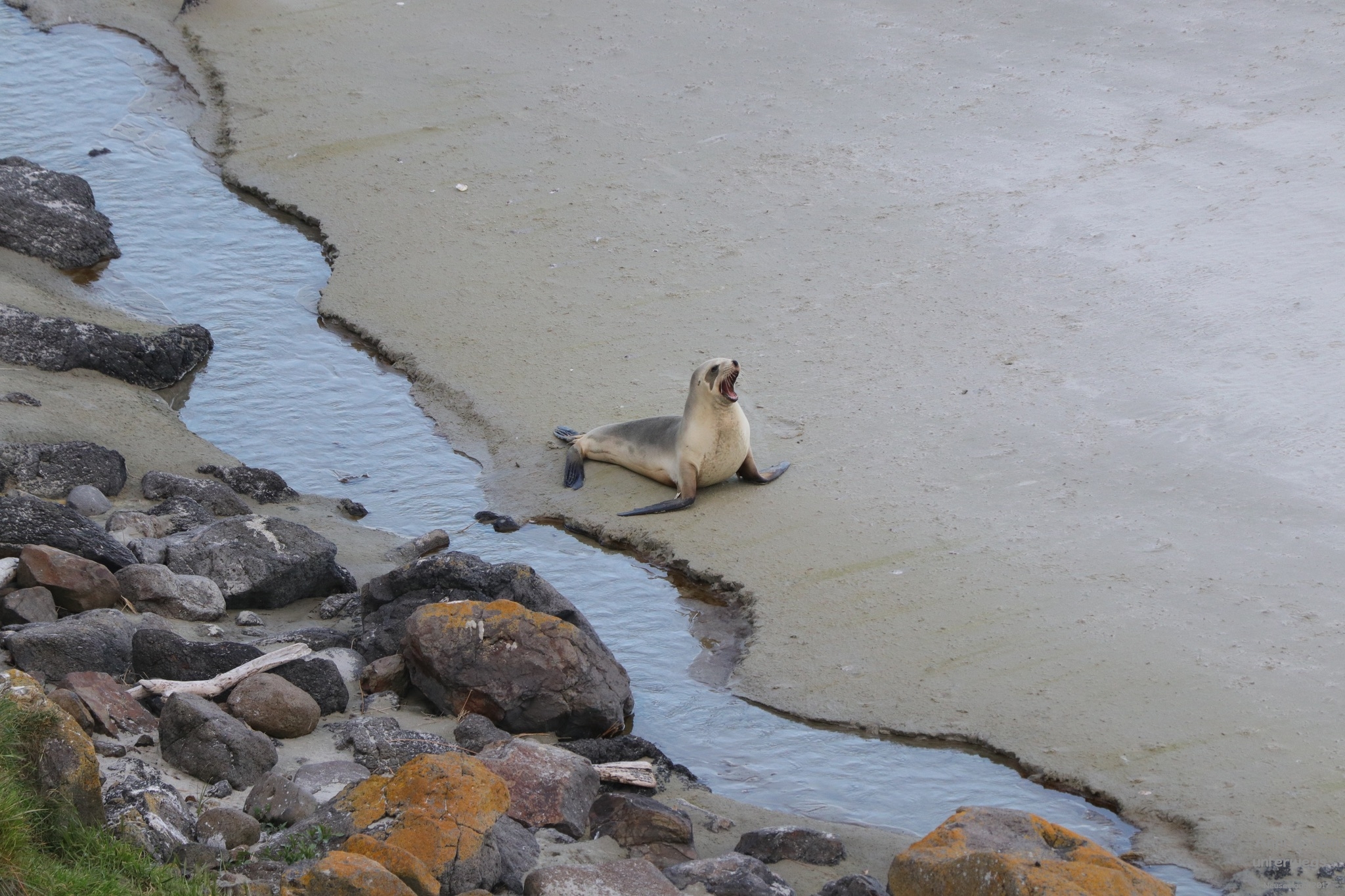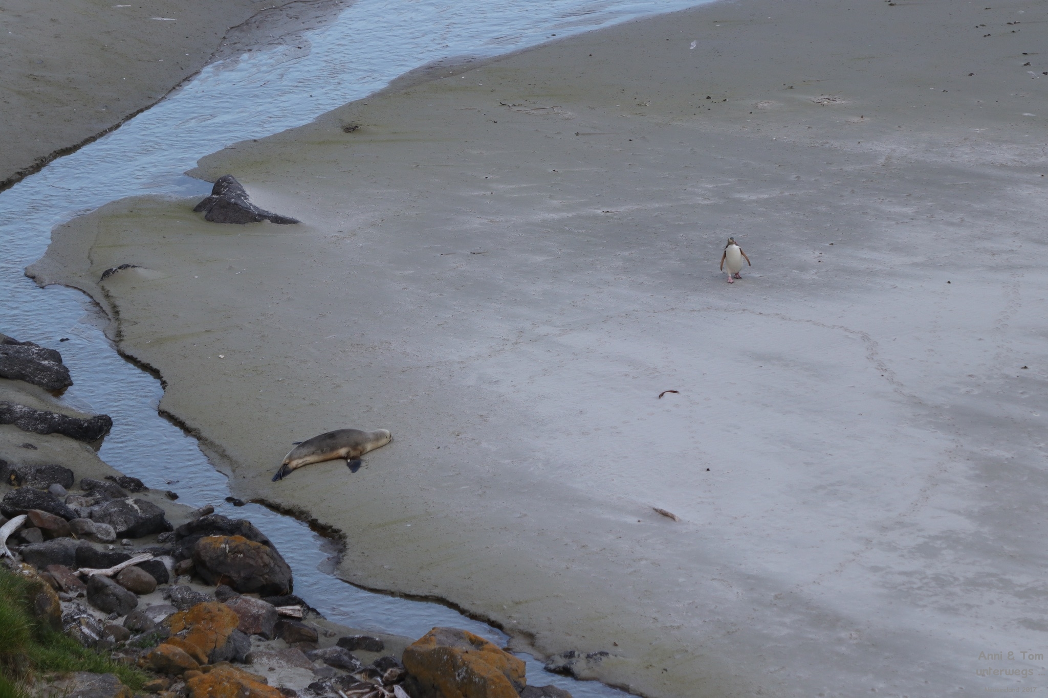 Vorbei an kleinen Blaupinguinen und Gelbaugenpinguinen gelangen wir an den Seelöwenstrand, an welchem wir sogar ein Männchen und ein Weibchen zu Gesicht bekommen.