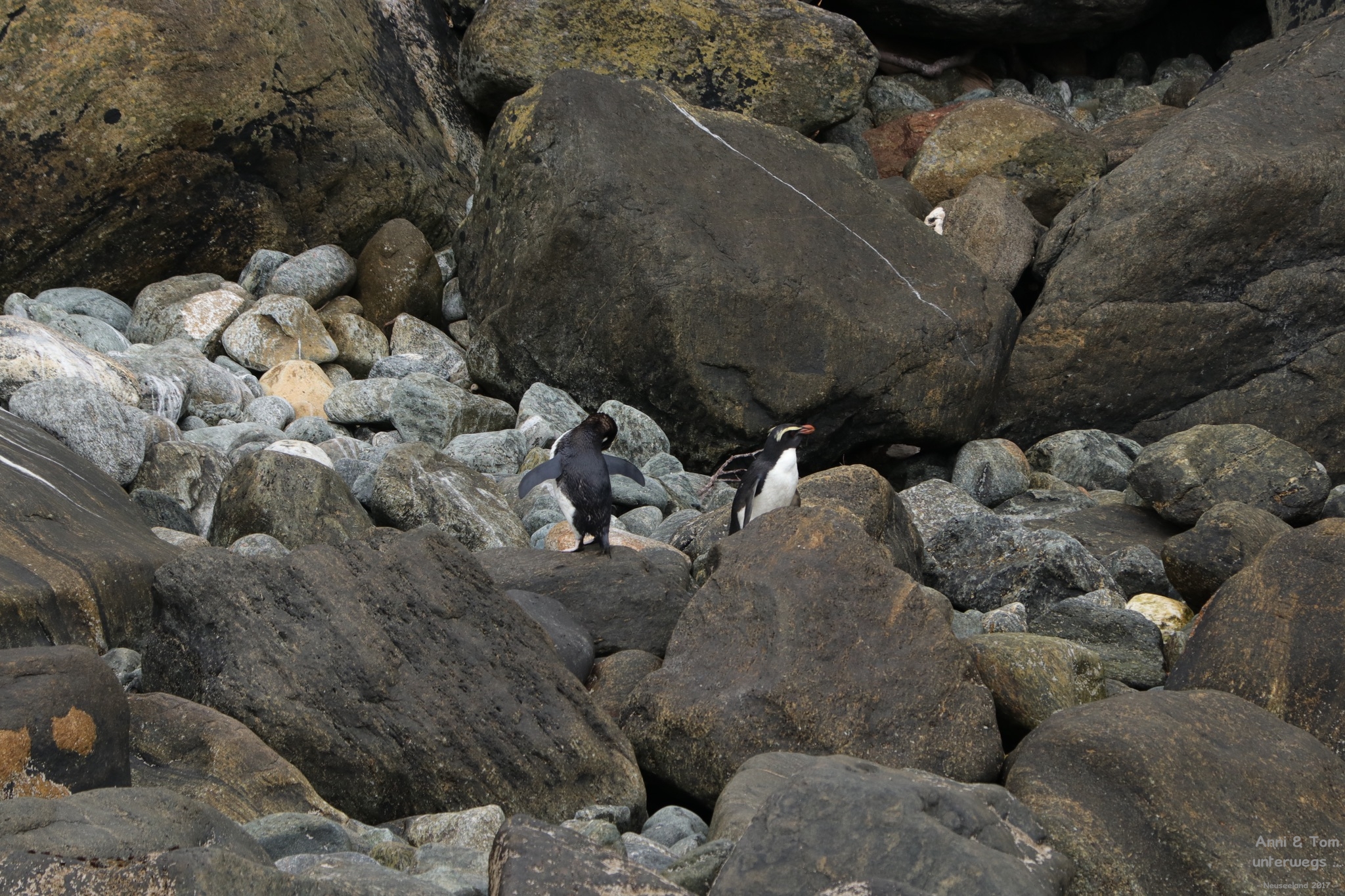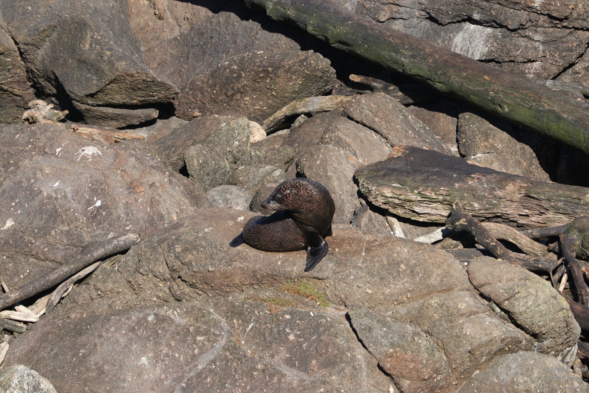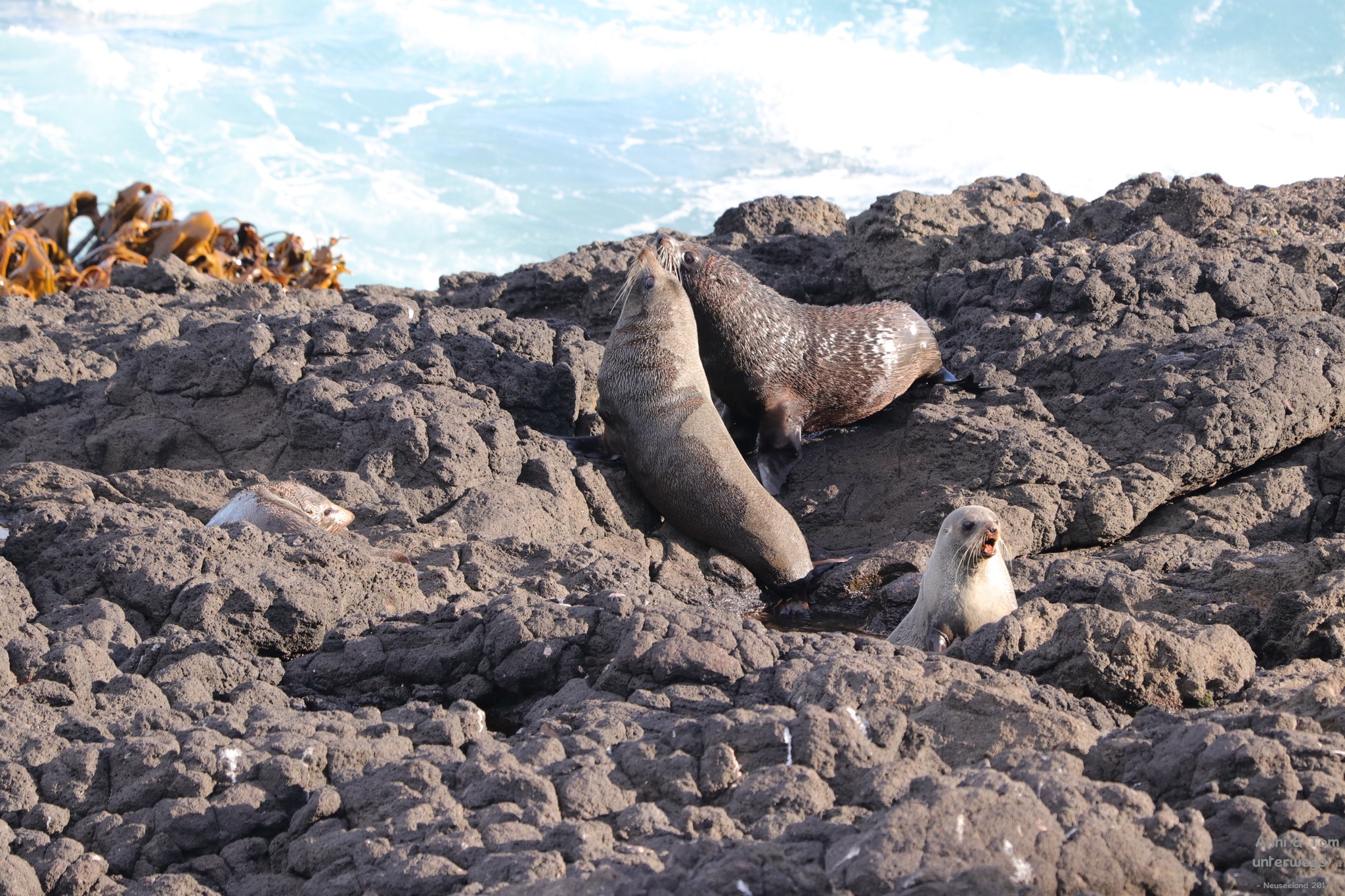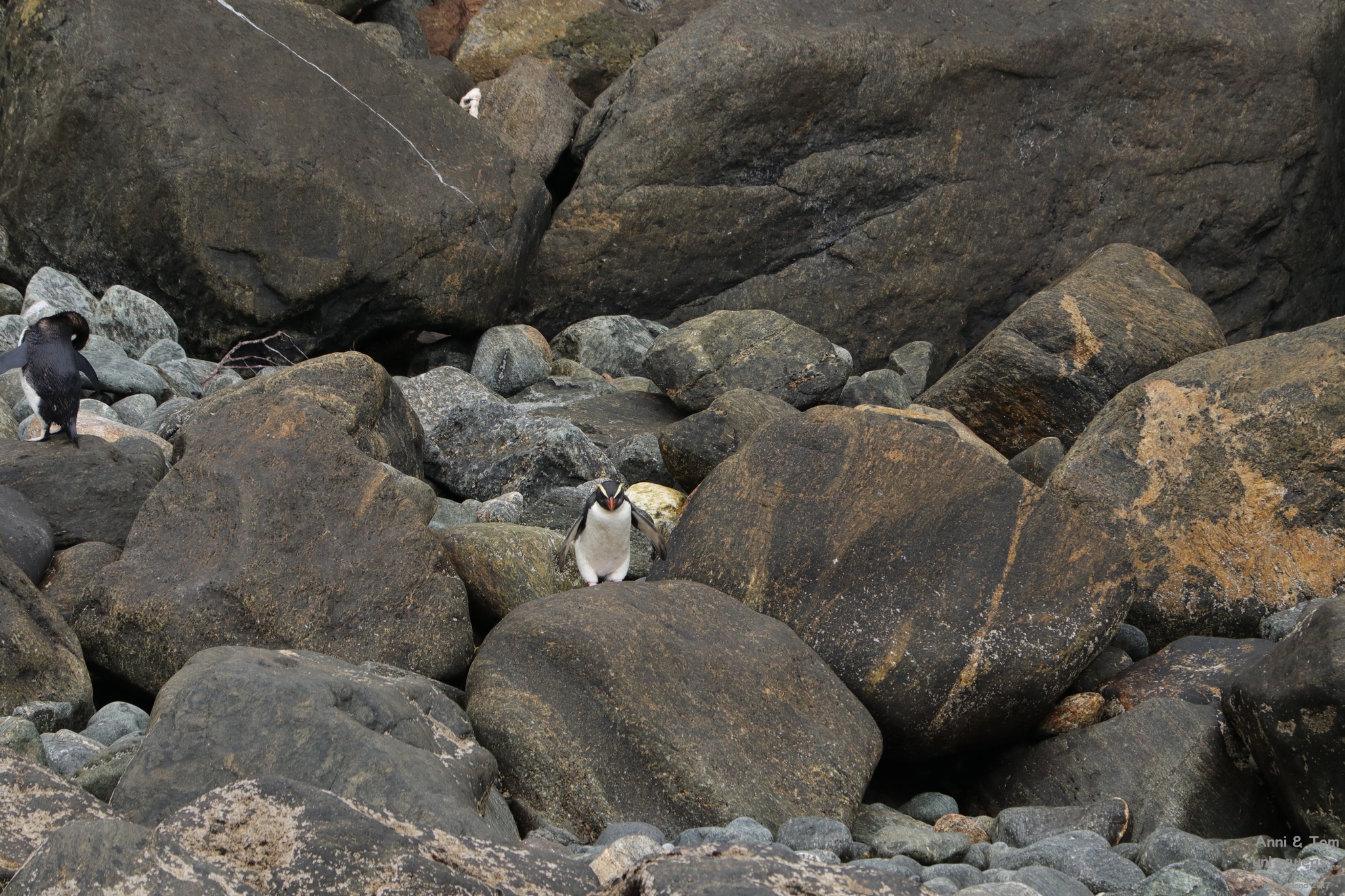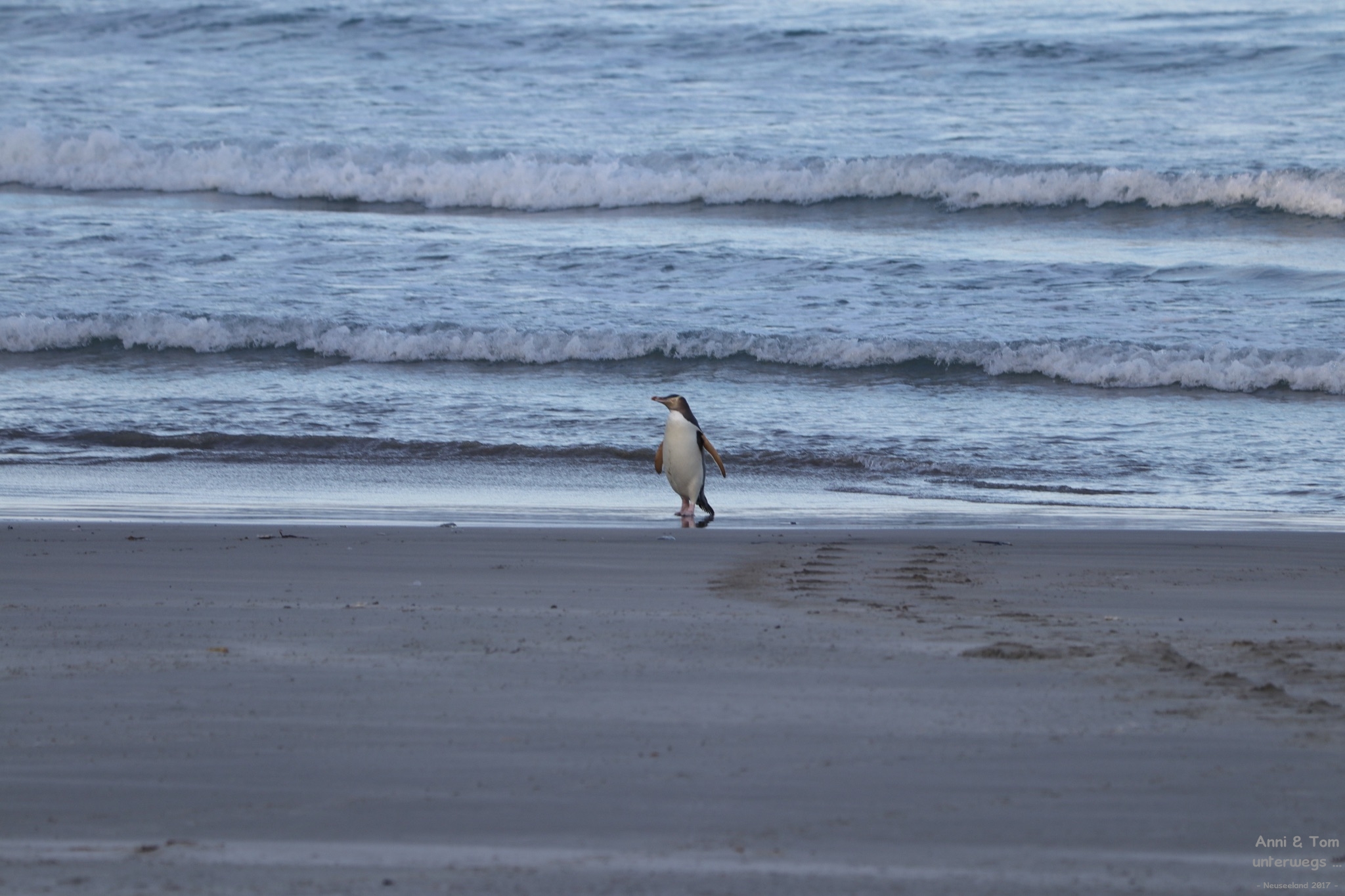 Vorbei an kleinen Blaupinguinen und Gelbaugenpinguinen gelangen wir an den Seelöwenstrand, an welchem wir sogar ein Männchen und ein Weibchen zu Gesicht bekommen.