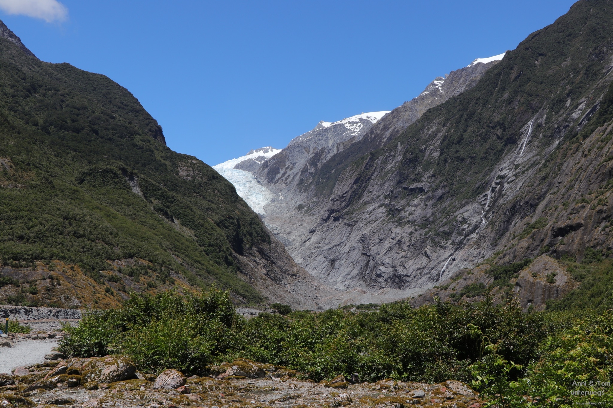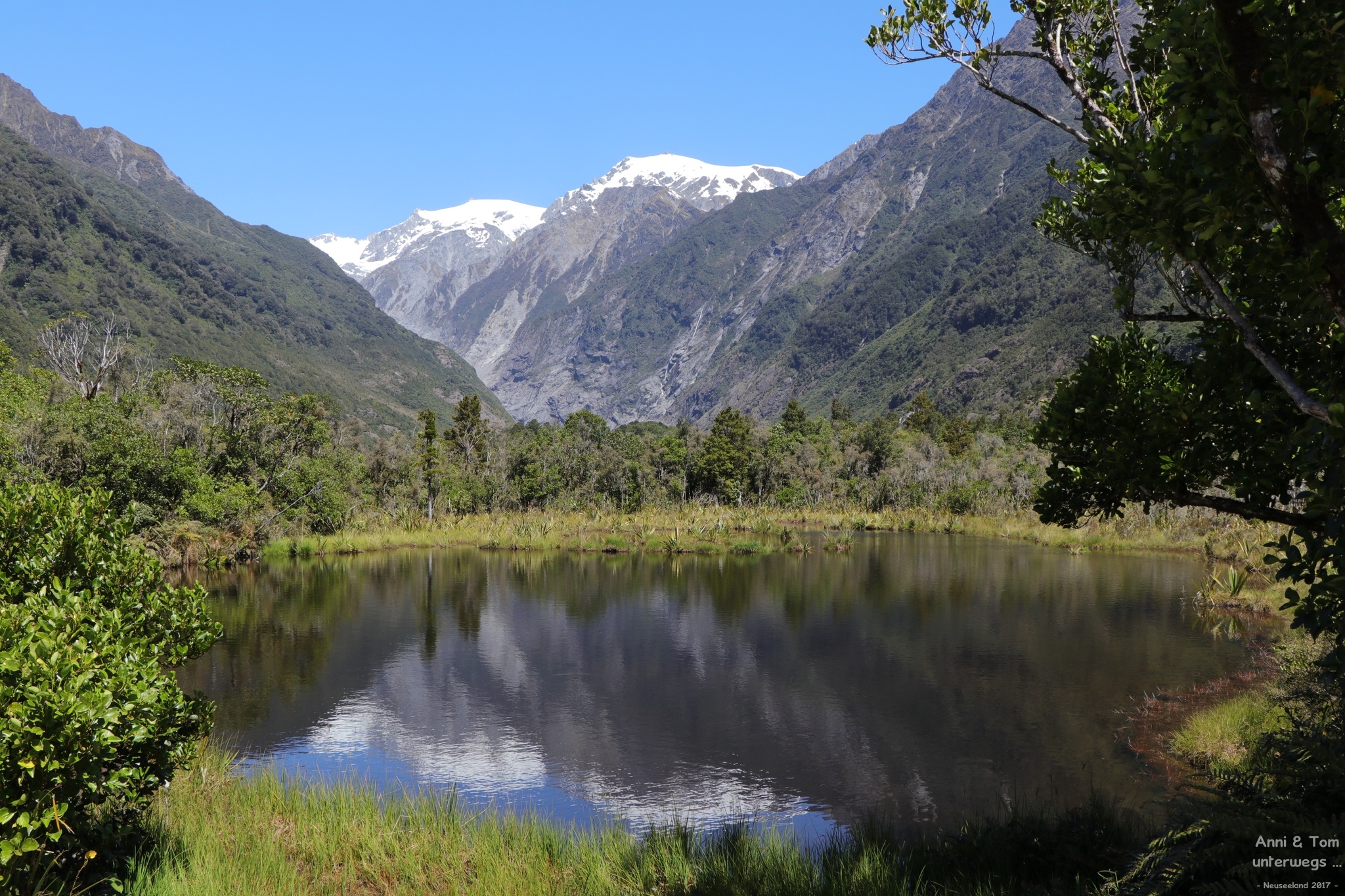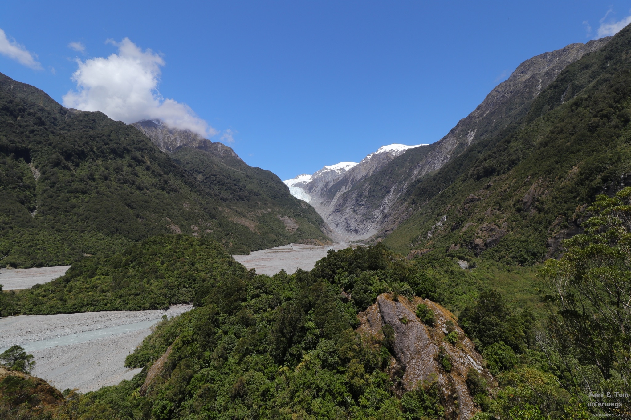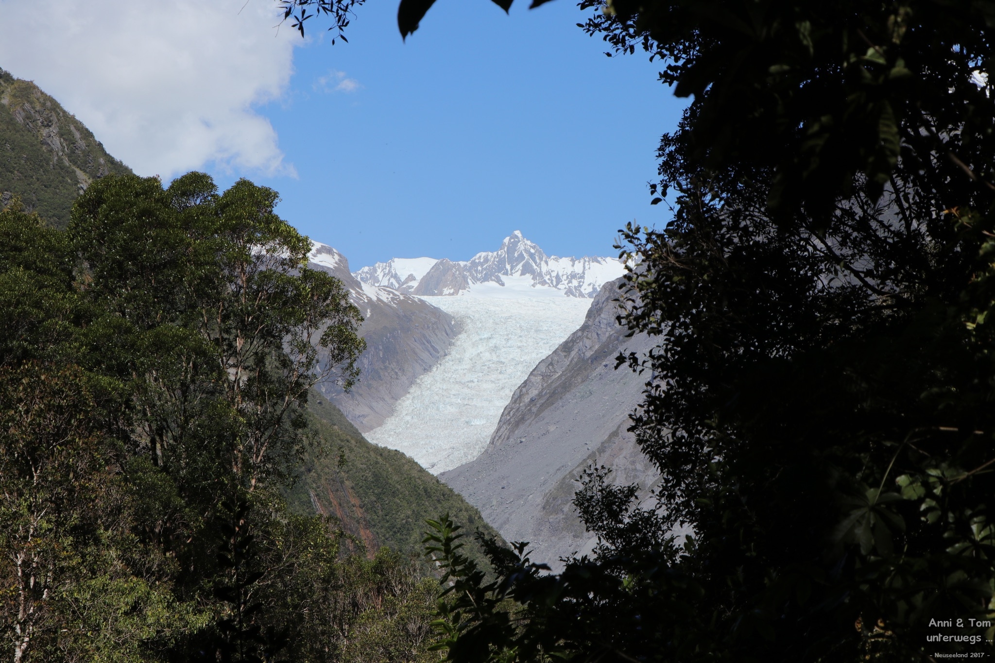 Unseren ersten Stopp machen wir am Franz Josef Gletscher. Aufgrund der globalen Erwärmung ist der Gletscher besonders in den letzten Jahren stark zurückgegangen. Daher bahnen wir uns unseren Weg zur Gletscherzunge durch das vom Gletscher geschaffene Tal, welches noch vor wenigen Jahren unter meterdickem Eis eingeschlossen war.