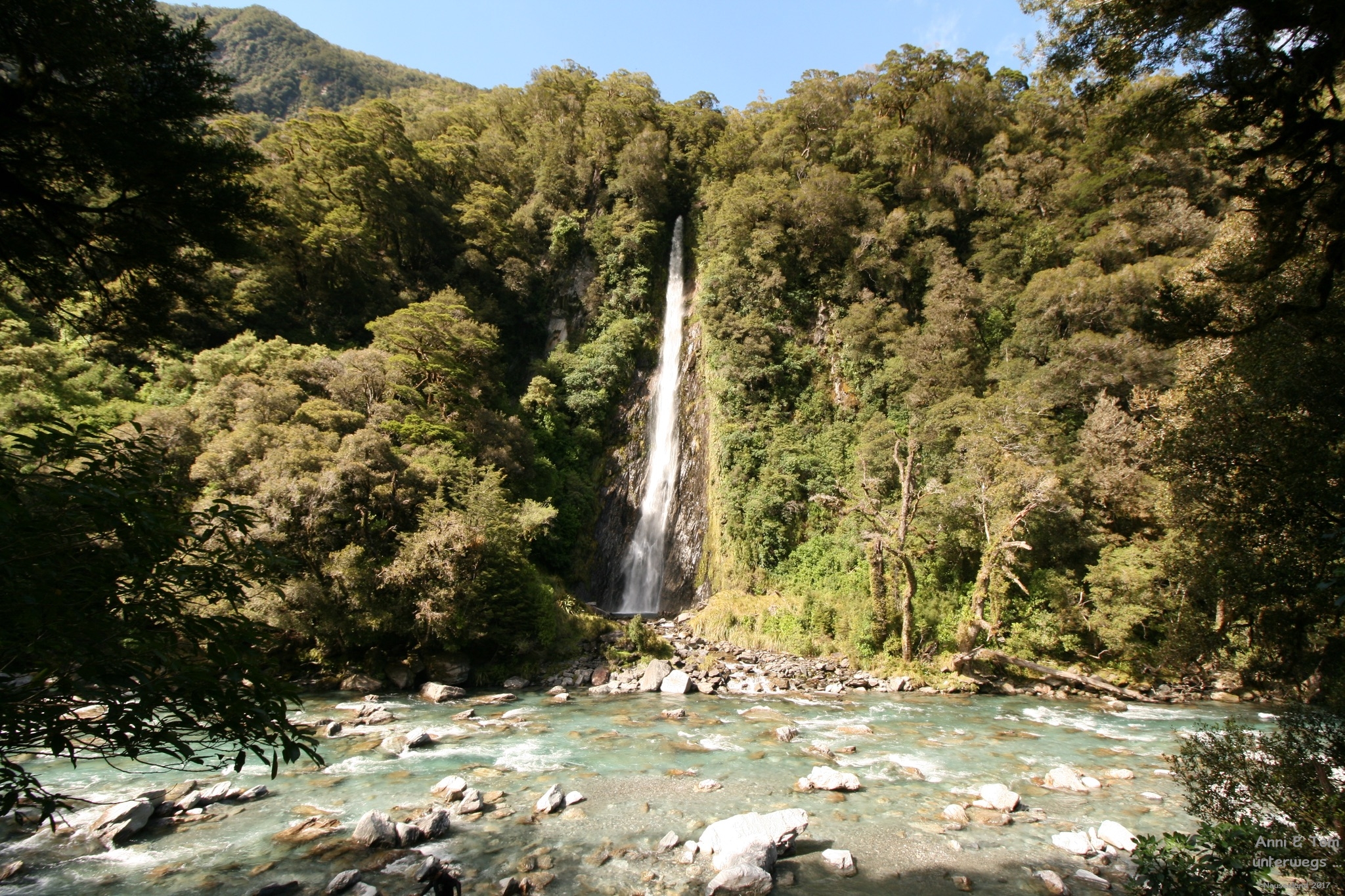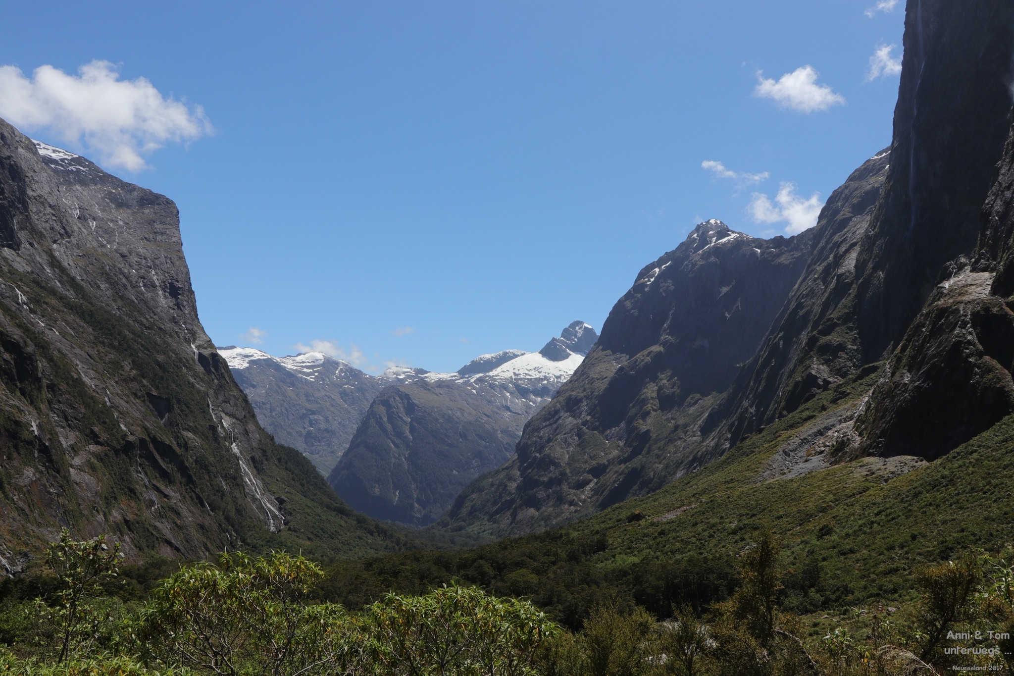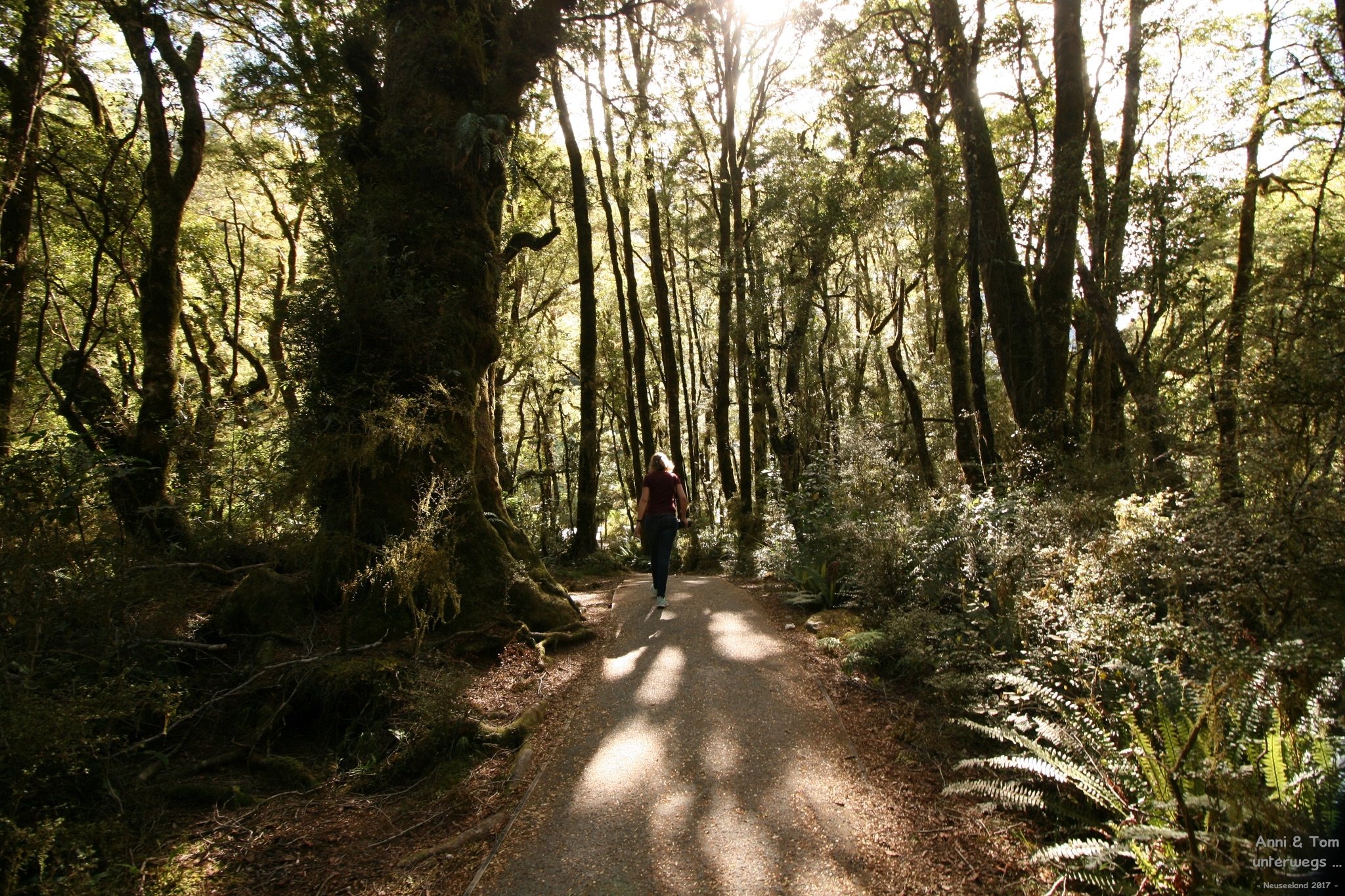 Ziemlich durchgefroren starten wir Richtung Milford Sound. Auf dem Weg dorthin fahren wir durch nebeldurchzogene Wälder und vorbei an zahlreichen Wasserfällen und Bergen.