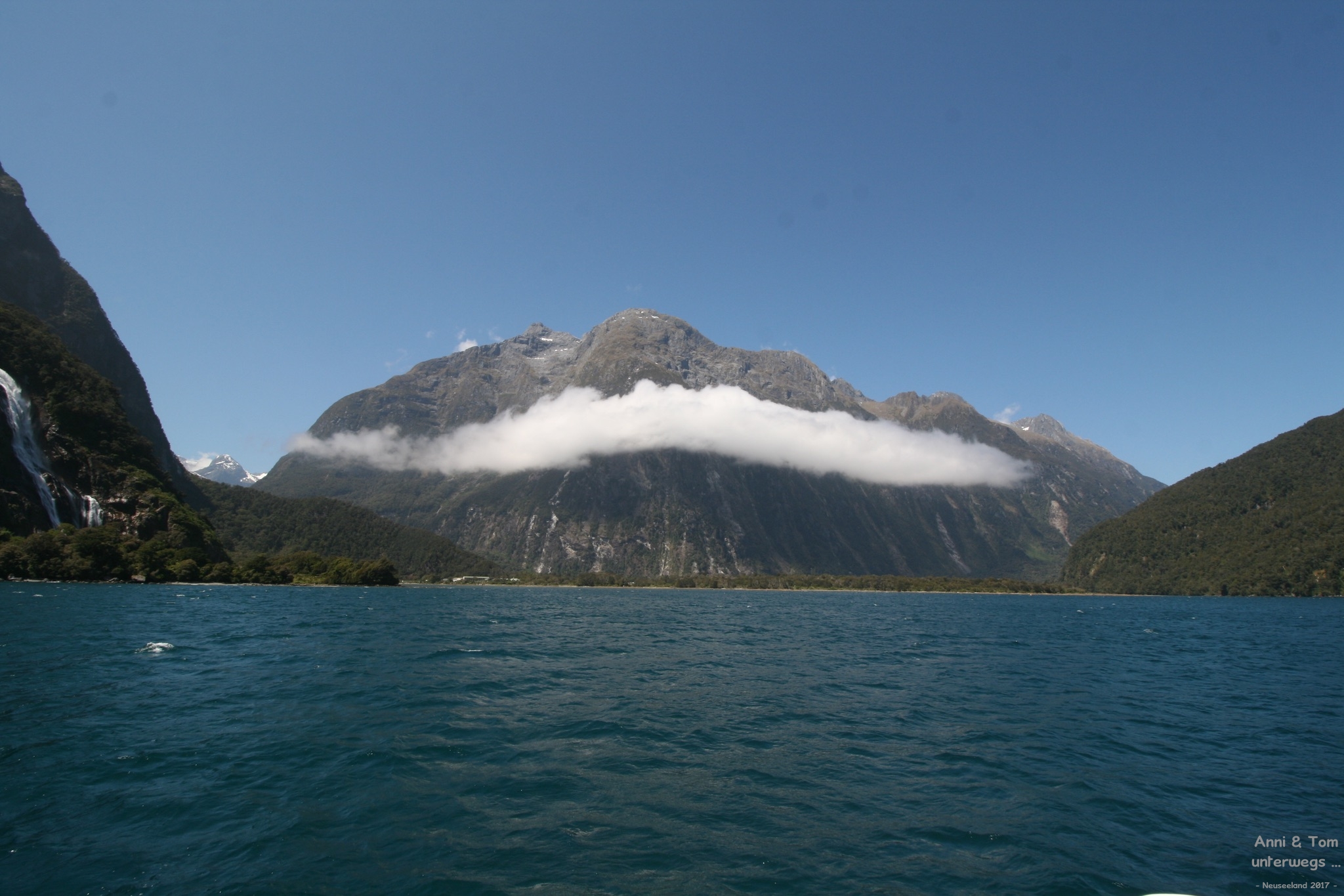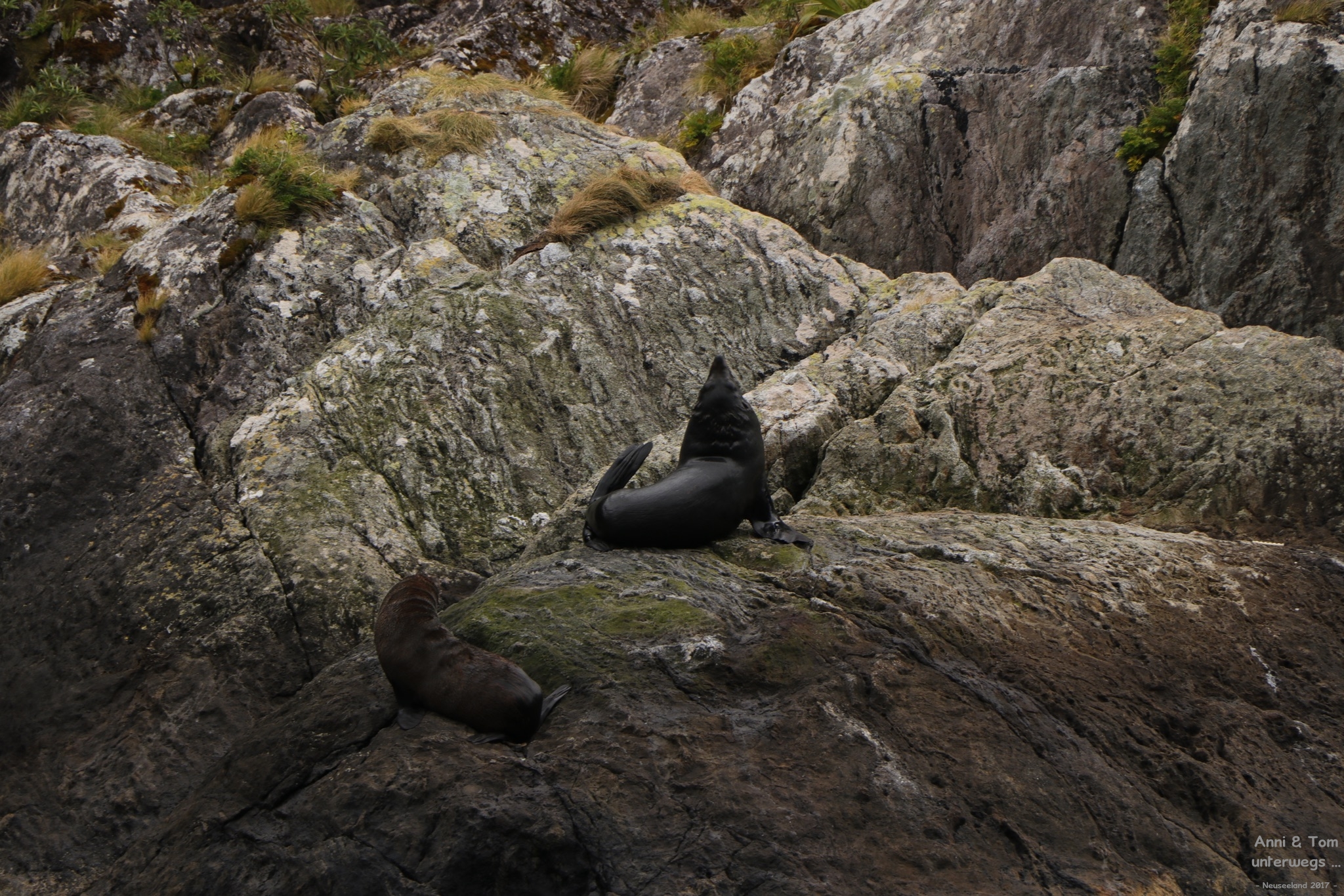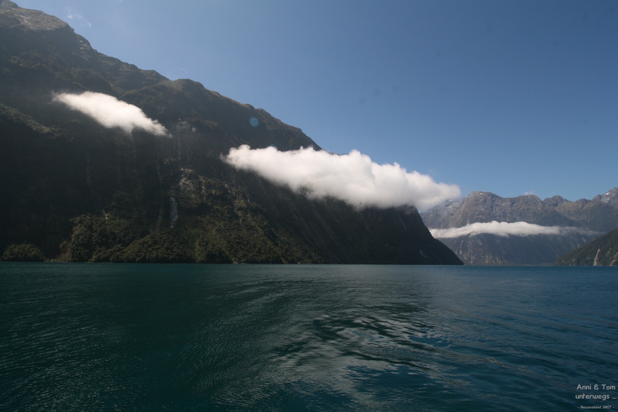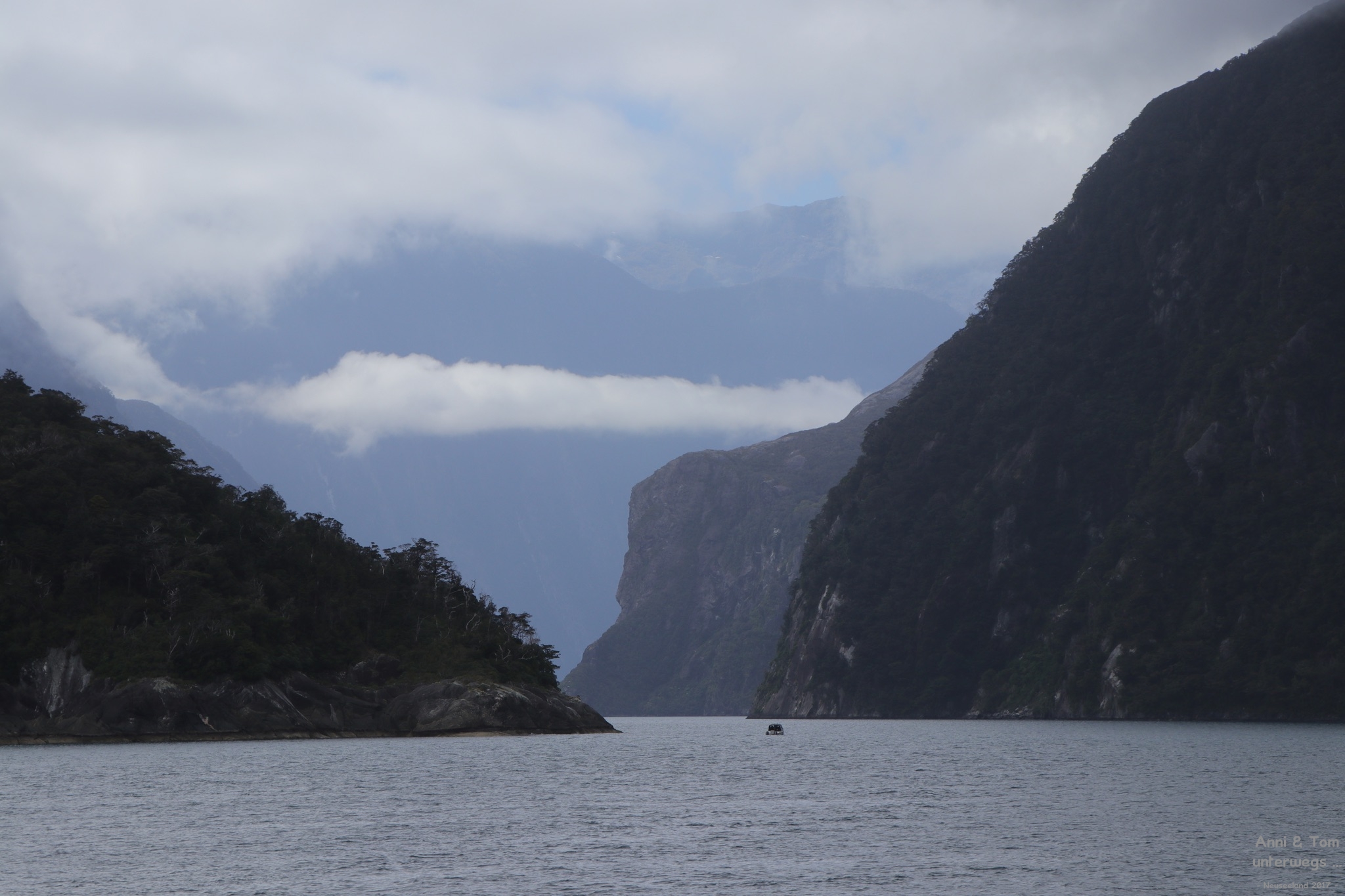 Mit dem Boot erkunden wir einige Stunden den Fjord. Während dieser Zeit sichten wir ein drei Fjordland Pinguine, welche nur hier leben und vom aussterben bedroht sind, und Seehunde. Aufgrund des geringen Niederschlags, in der letzten Zeit, sehen wir "nur" permanente Wasserfälle, die zahlreichen temporären bleiben uns vorenthalten.