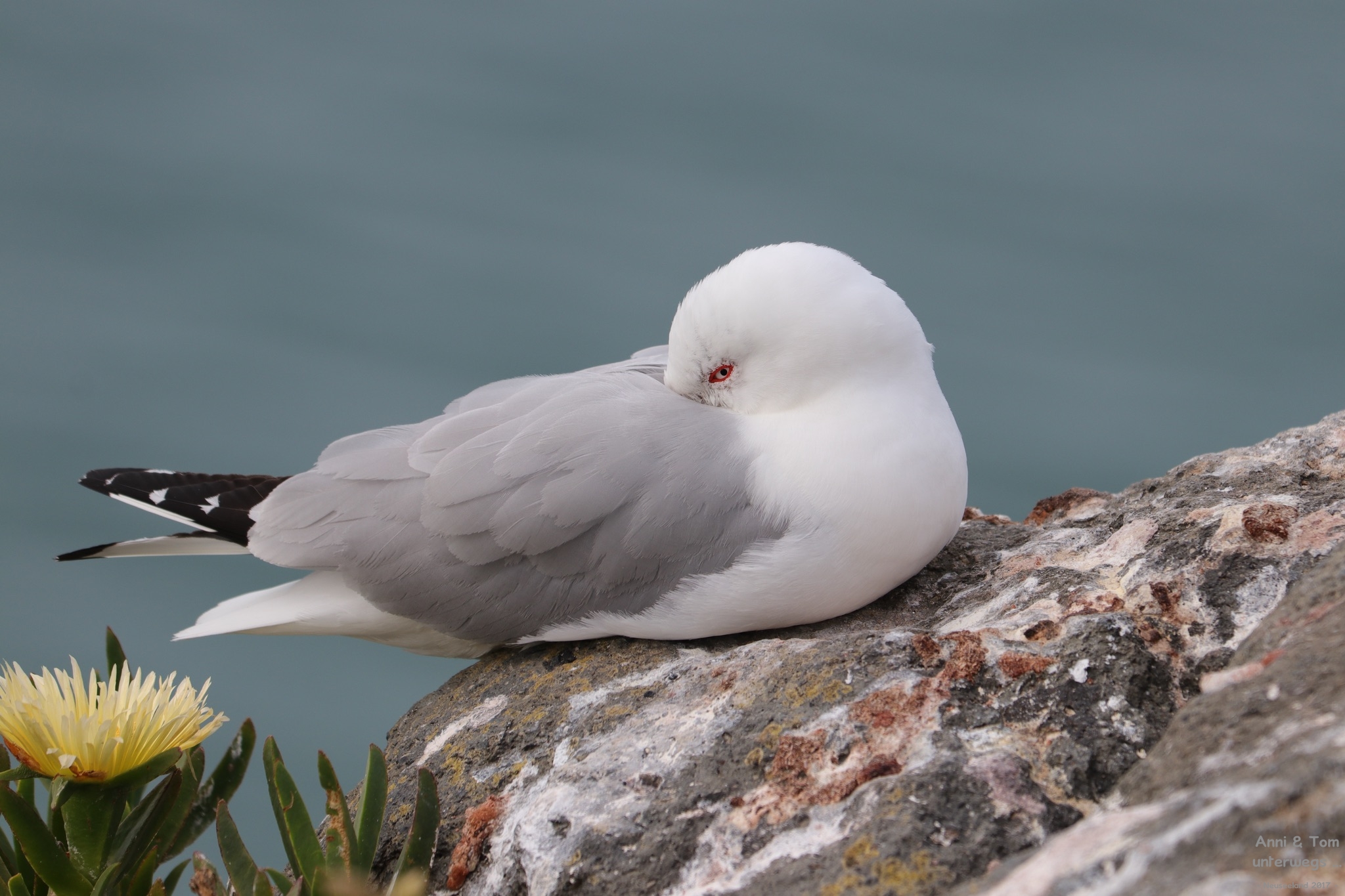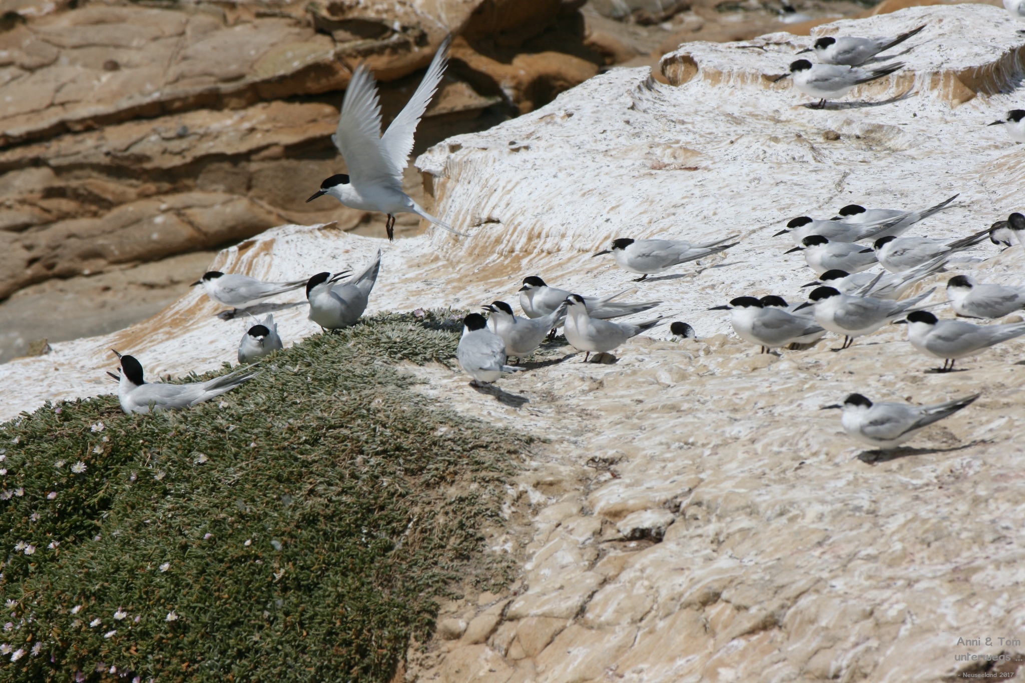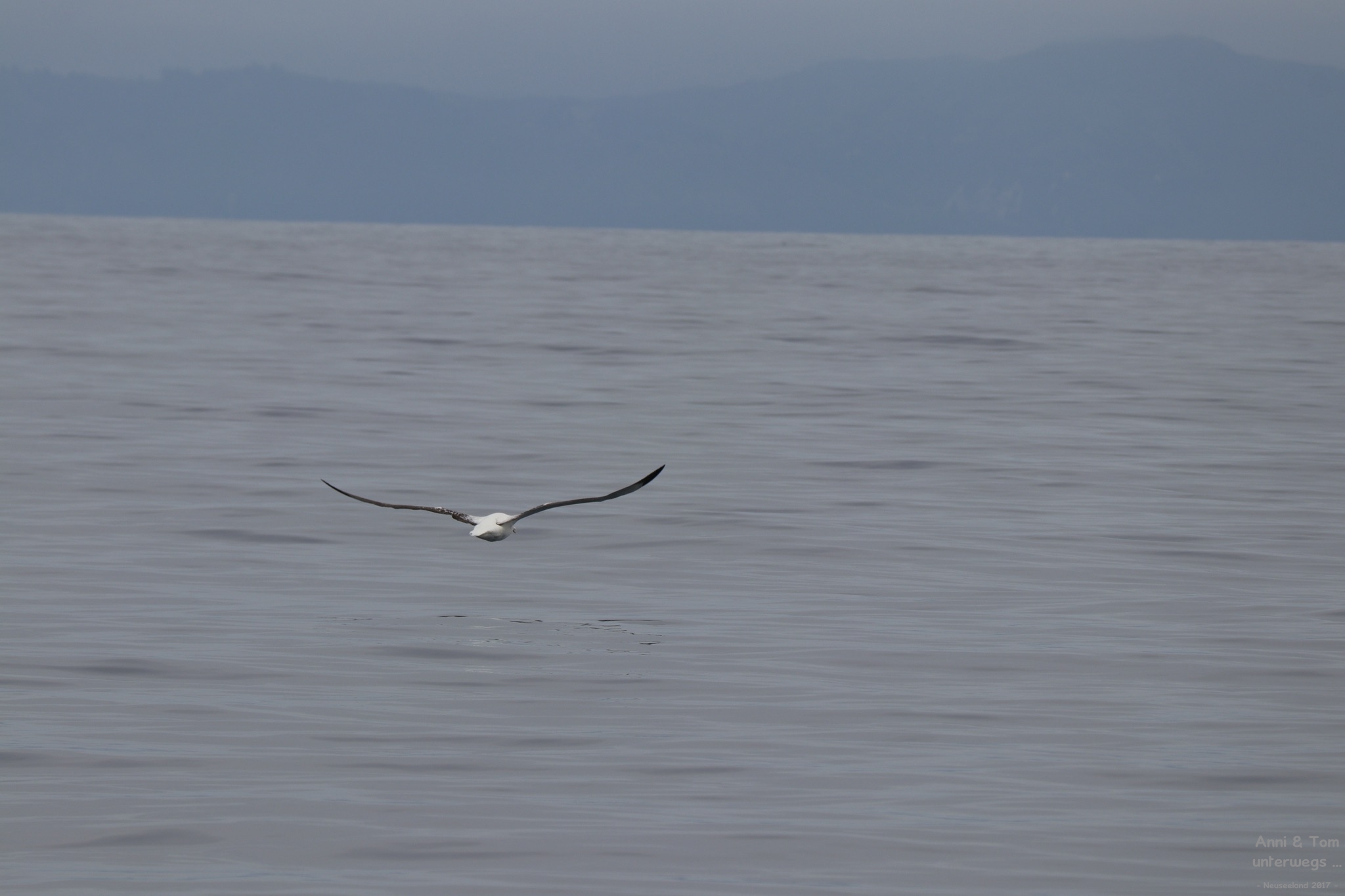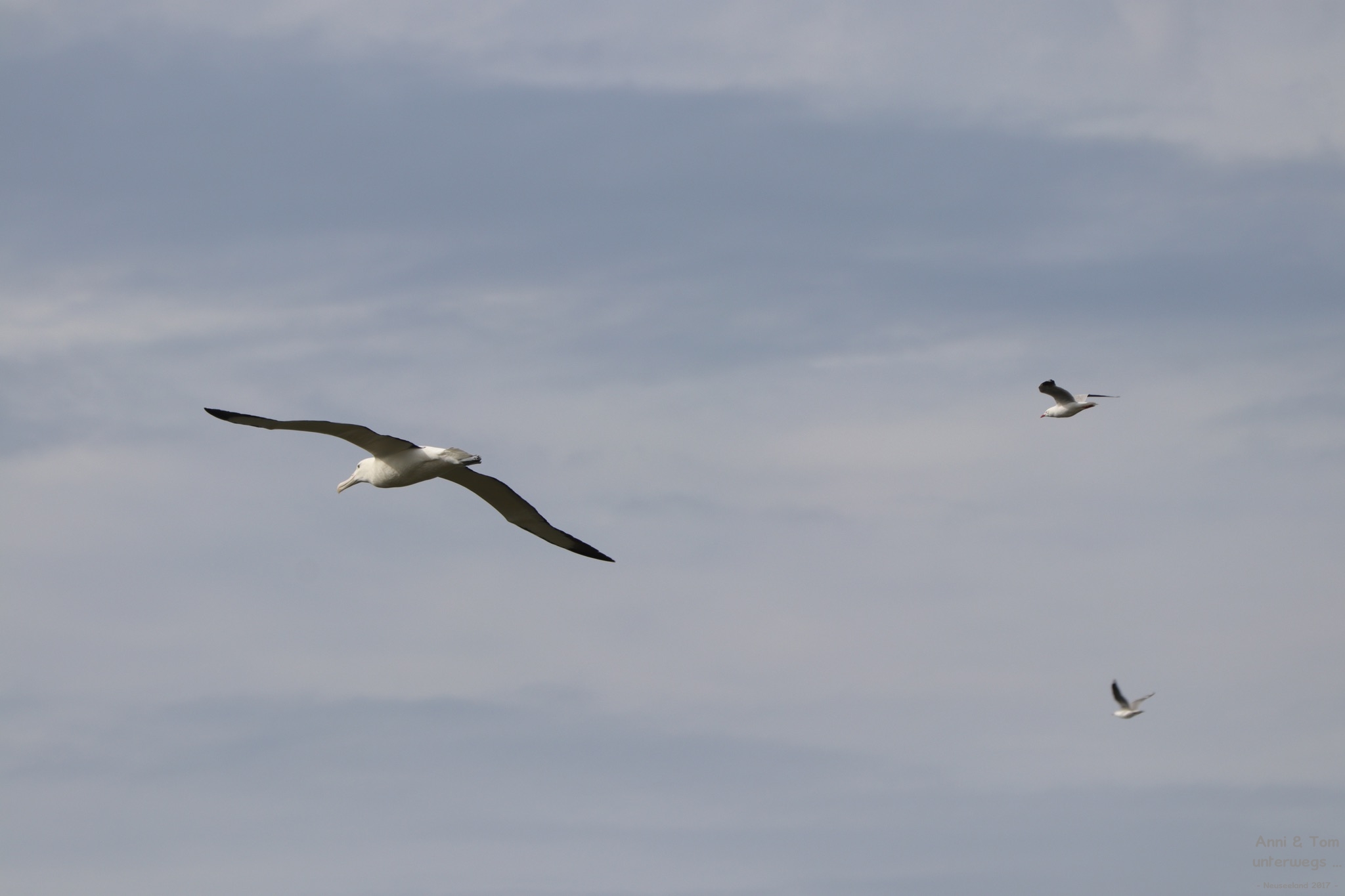 Zuerst geht es zum einzigen auf Festland gelegenen Albatrossbrutfelsen der Erde. Da es anfangs sehr windstill ist, sehen wir leider nur Möven und Kormorane; kurz vor der Weiterfahrt steigt die "Party" jedoch noch. Sobald genügend Wind aufkommt, zeigen die Männchen ihre Flugfähigkeiten, um den Weibchen zu imponieren - auch Party genannt.