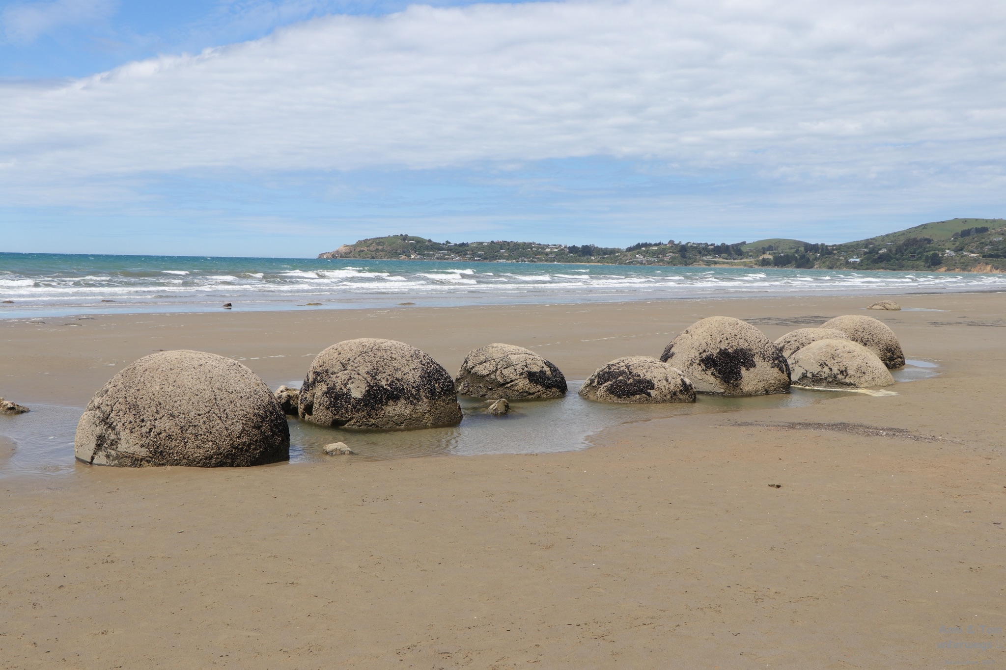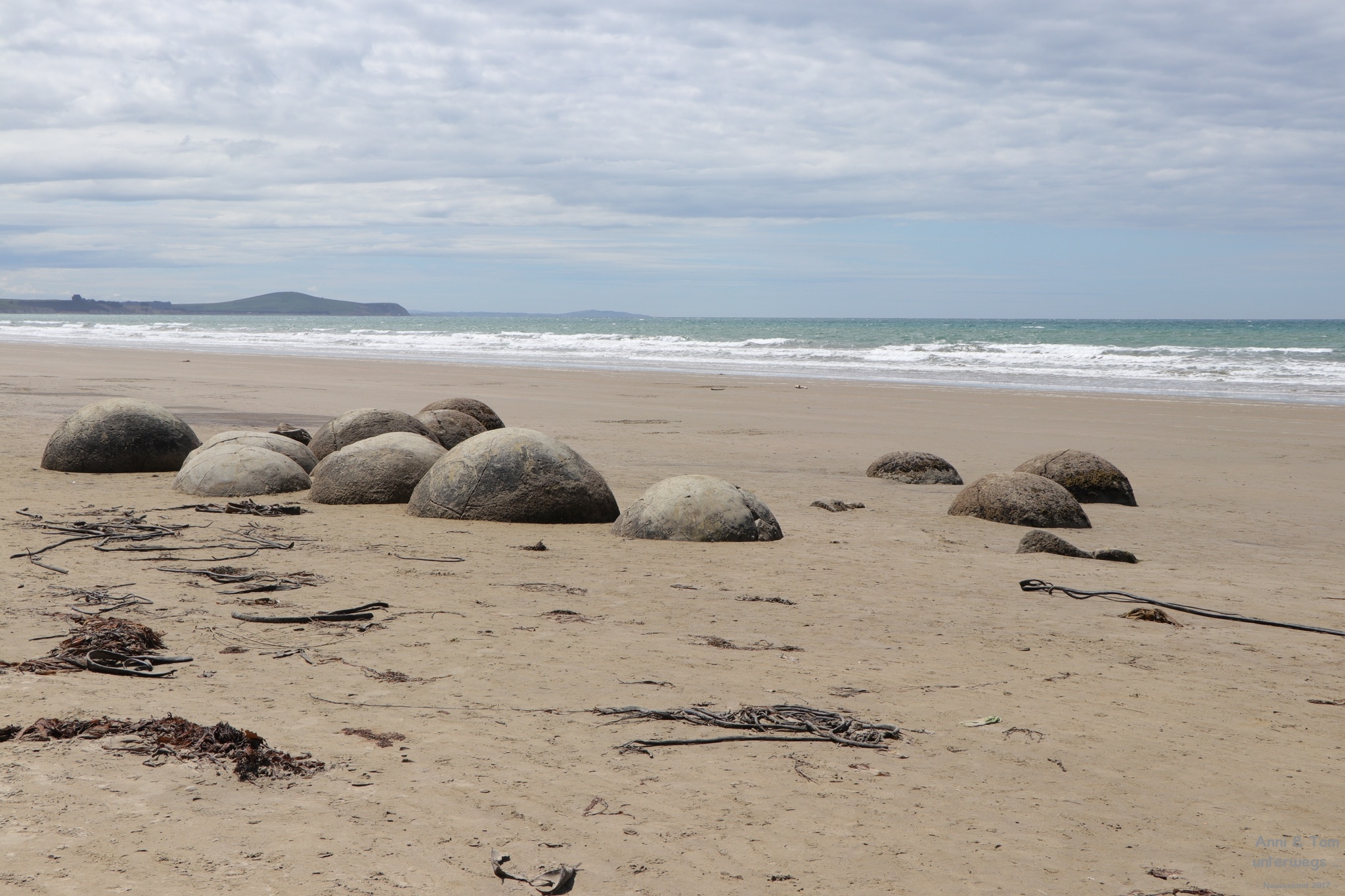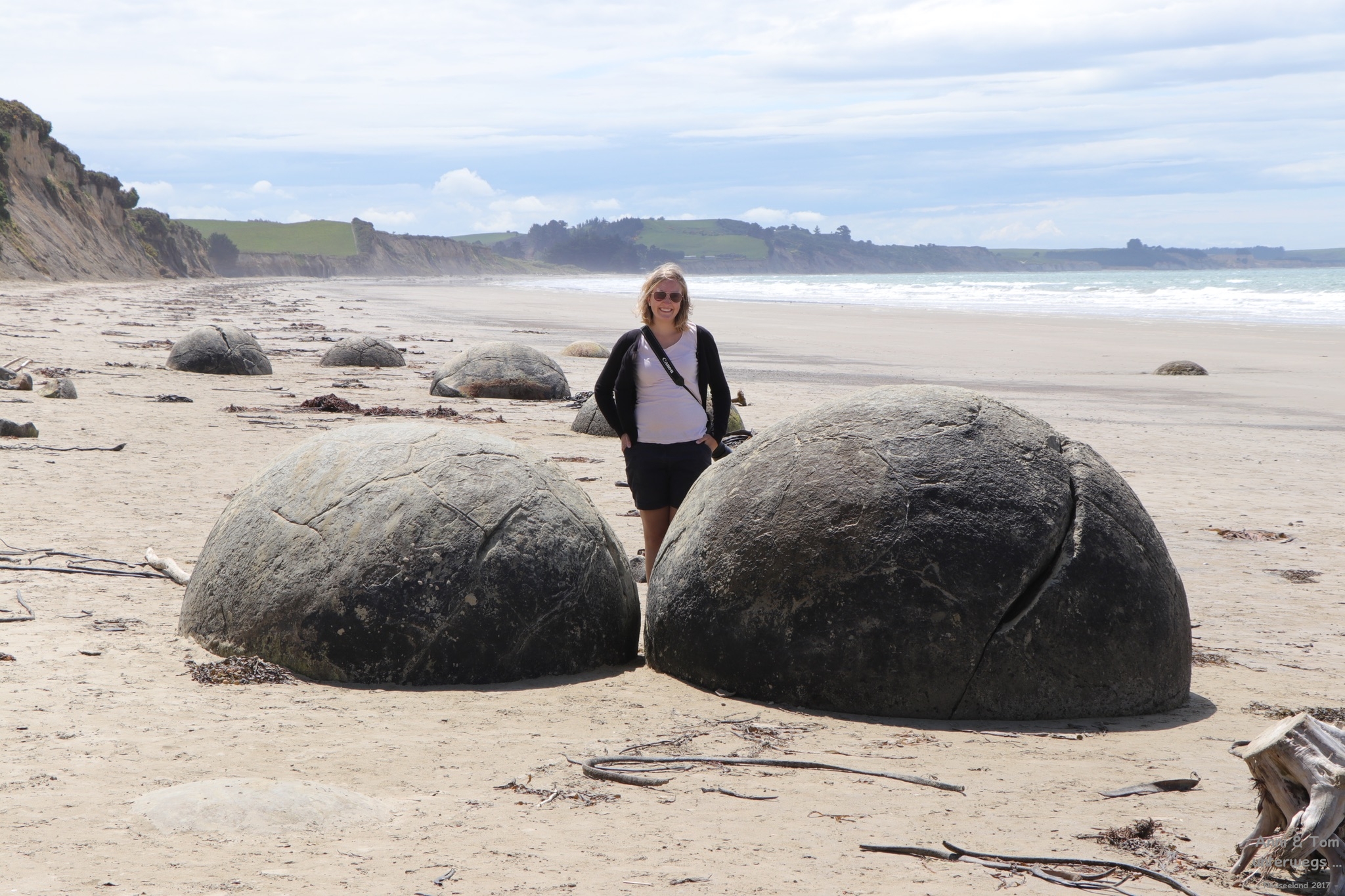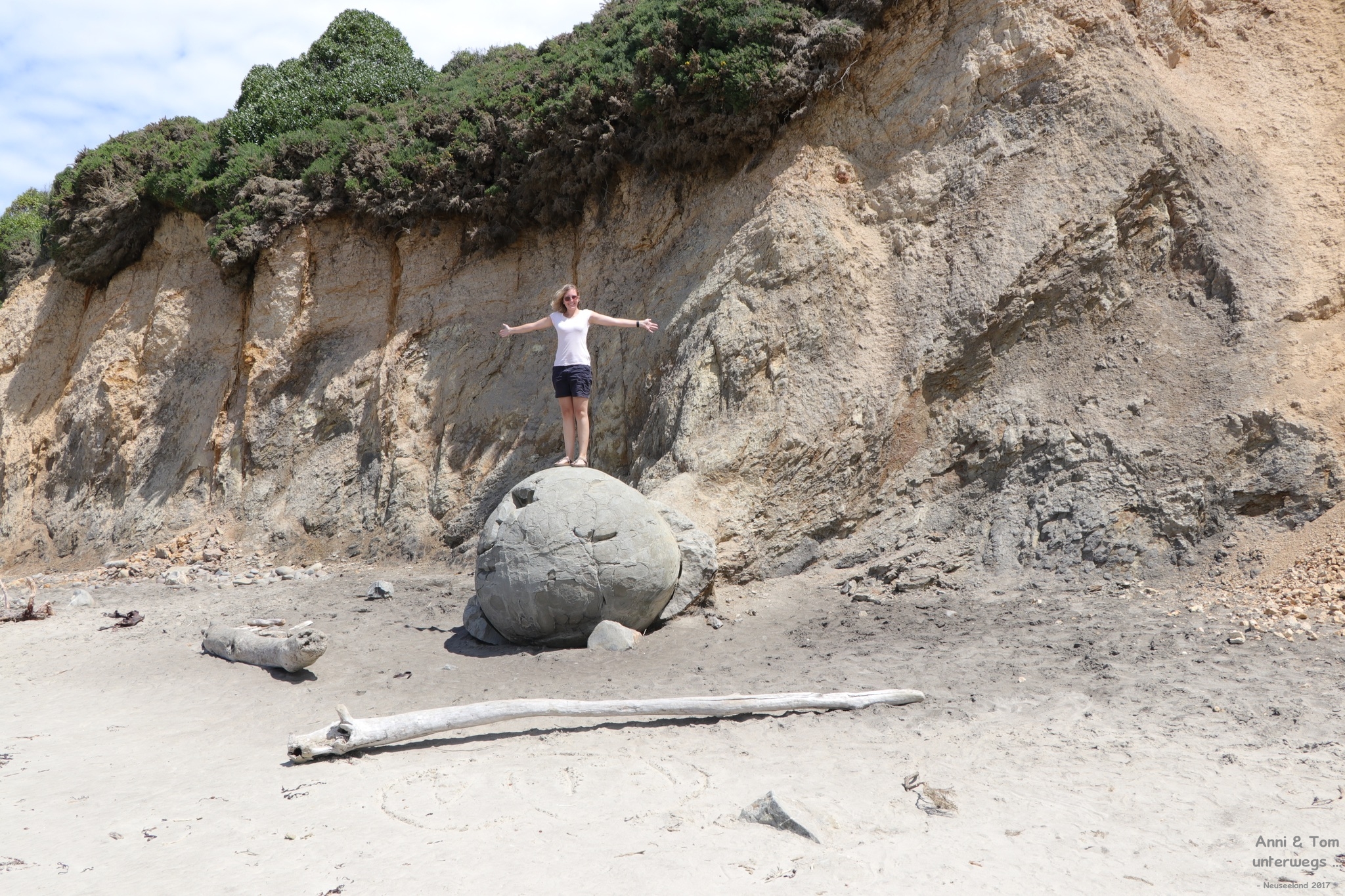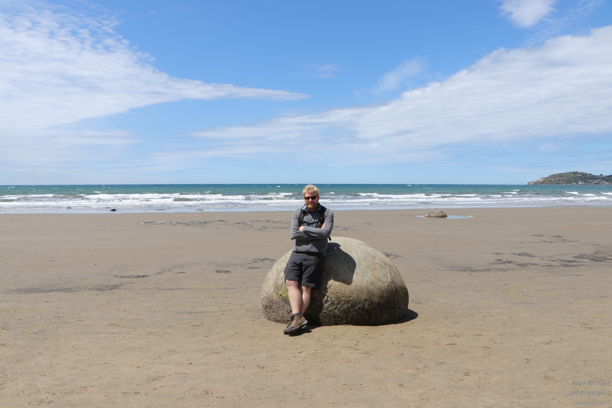 Auf dem Weg machen wir einen Stopp am Moeraki Beach, an welchem Millionen Jahre alte Steinkugeln im Sand ruhen. Diese haben einen Durchmesser von bis zu vier Metern.