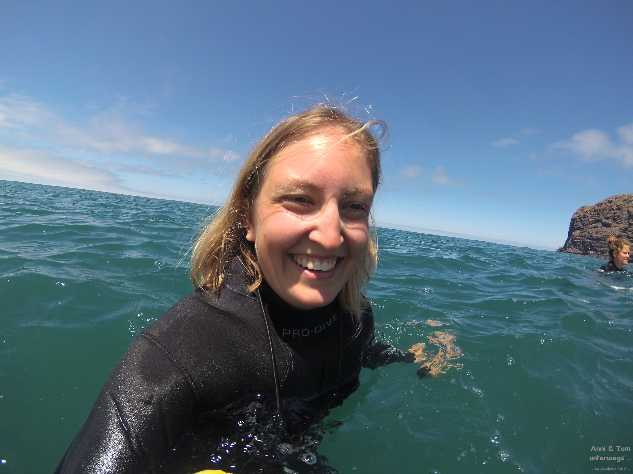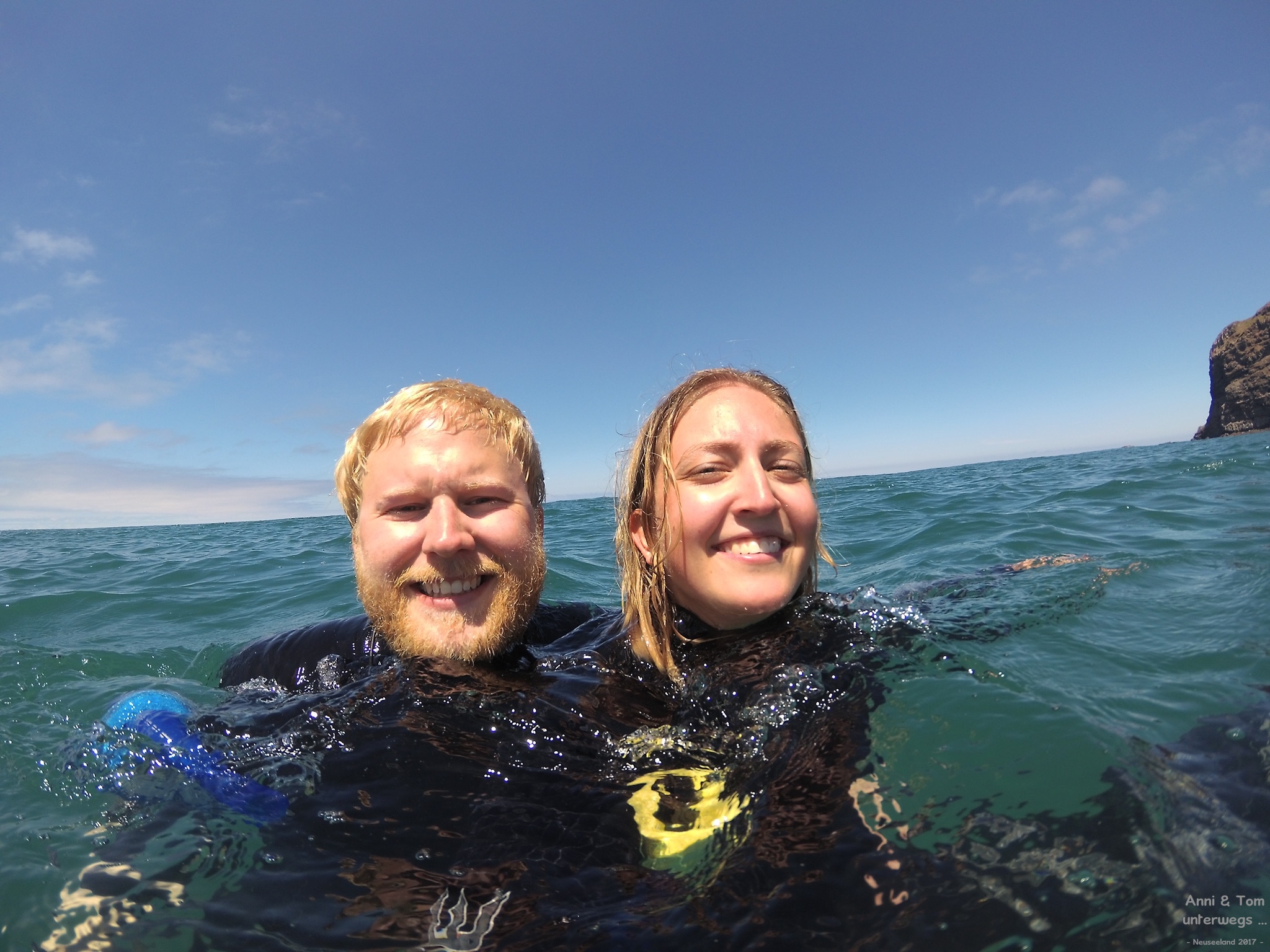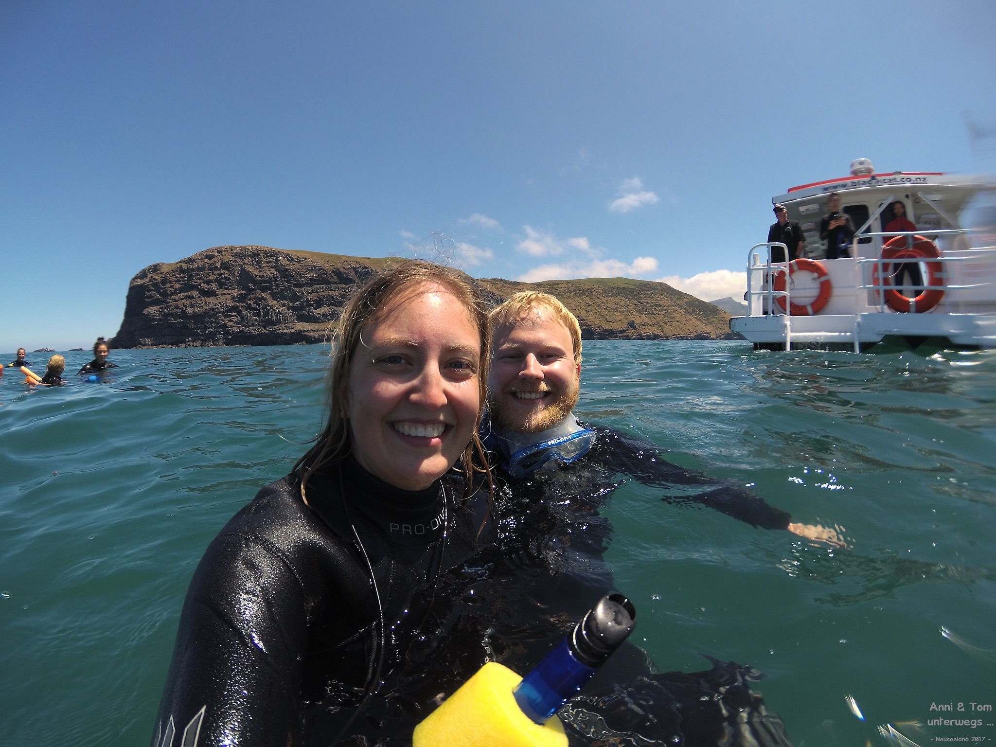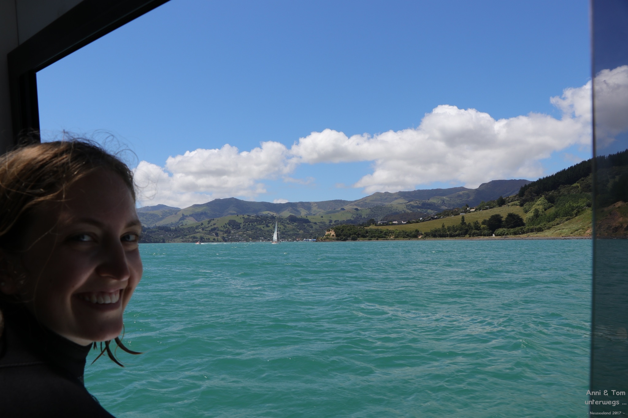 Heute machen wir eine Bootsfahrt in die Bucht von Akaroa. Bevor es losgeht, werden wir mit Neoprenanzügen, Taucherbrillen und Schnorcheln ausgestattet. So sind für das Schwimmen mit Delfinen bestens gerüstet :-)