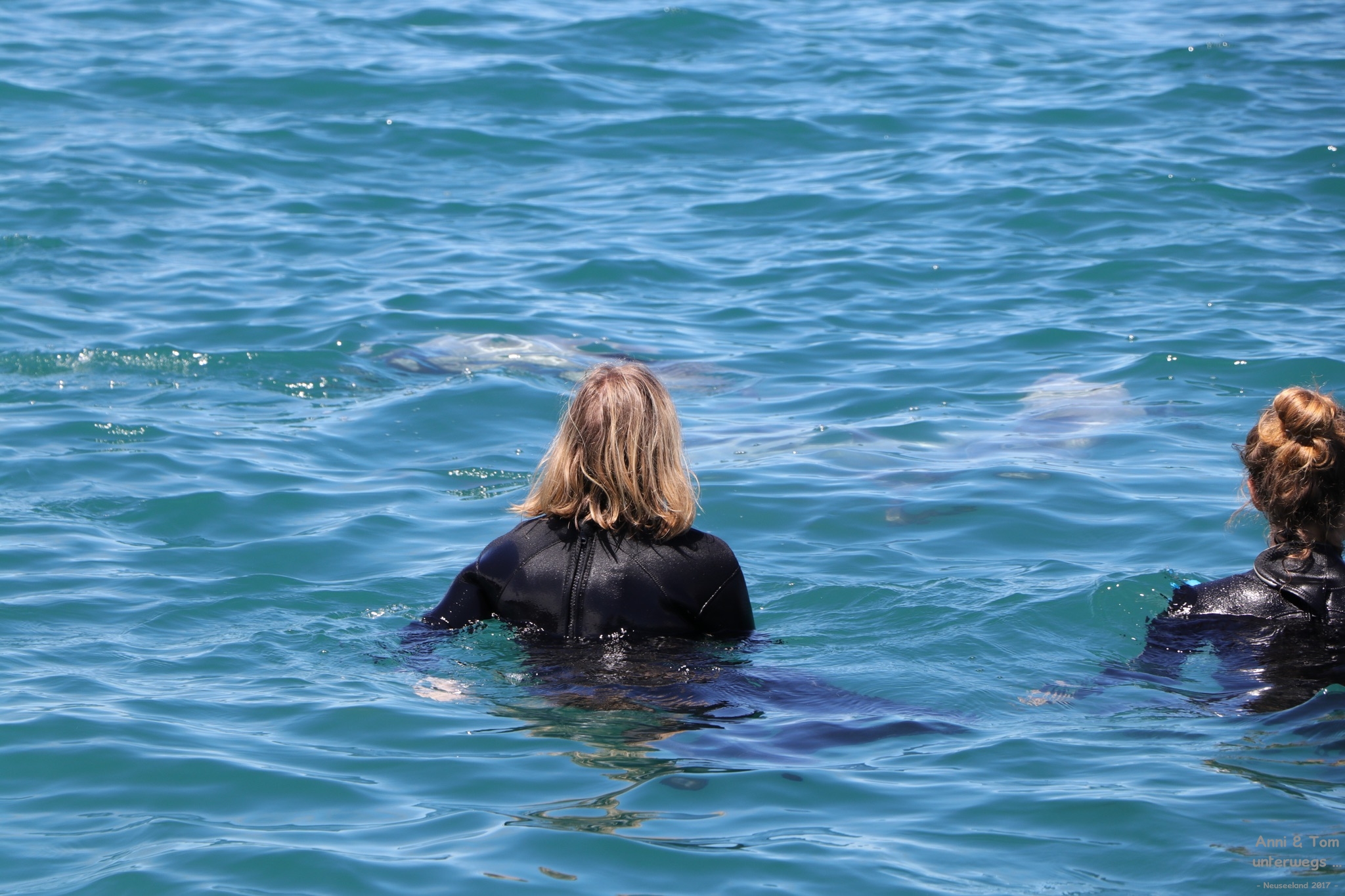 Mittlerweile haben sich ca. sechs Tiere um uns versammelt, sie schwimmen zwischen uns durch, tauchen mal wieder auf oder sind auch mal ein paar Minuten verschwunden. Da sie aber immer wieder zu uns geschwommen kommen, können wir die volle Zeit im Wasser genießen und den wilden Tieren hautnah begegnen.