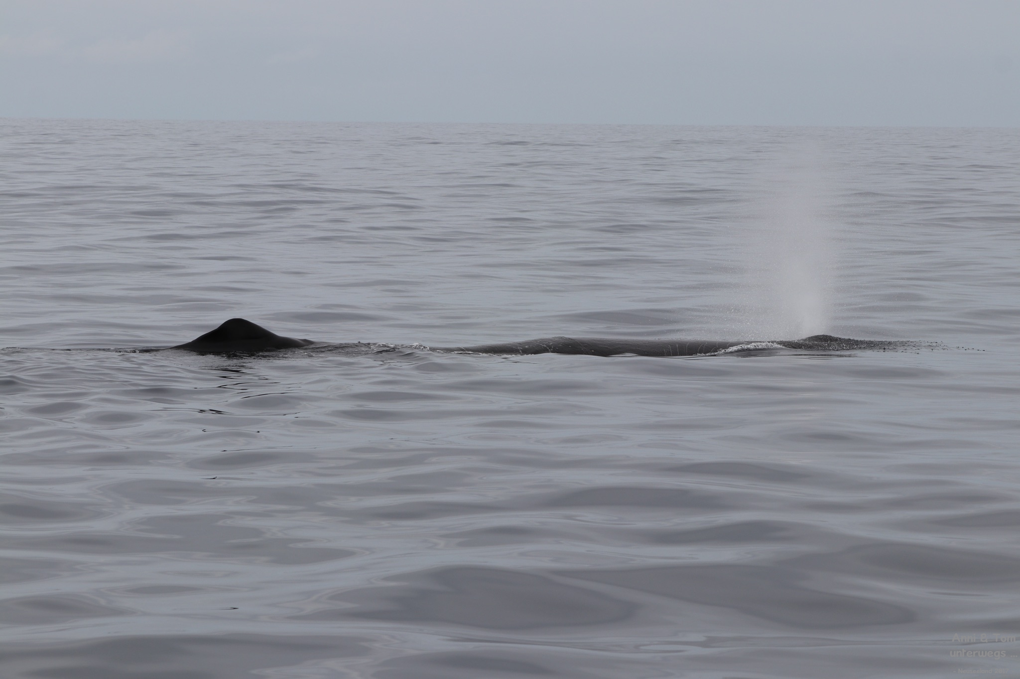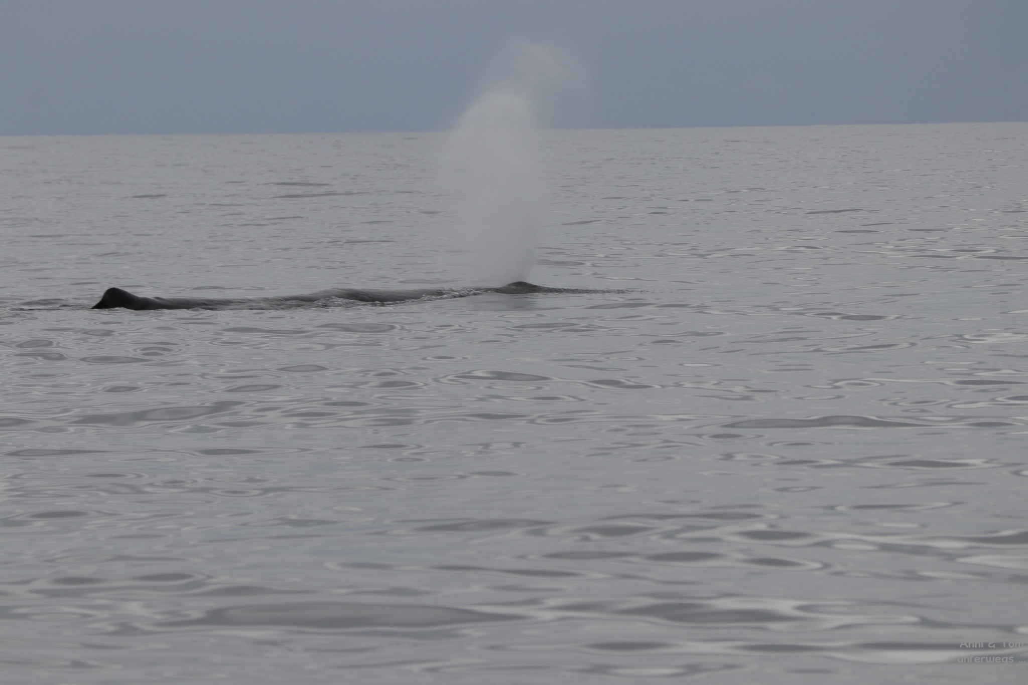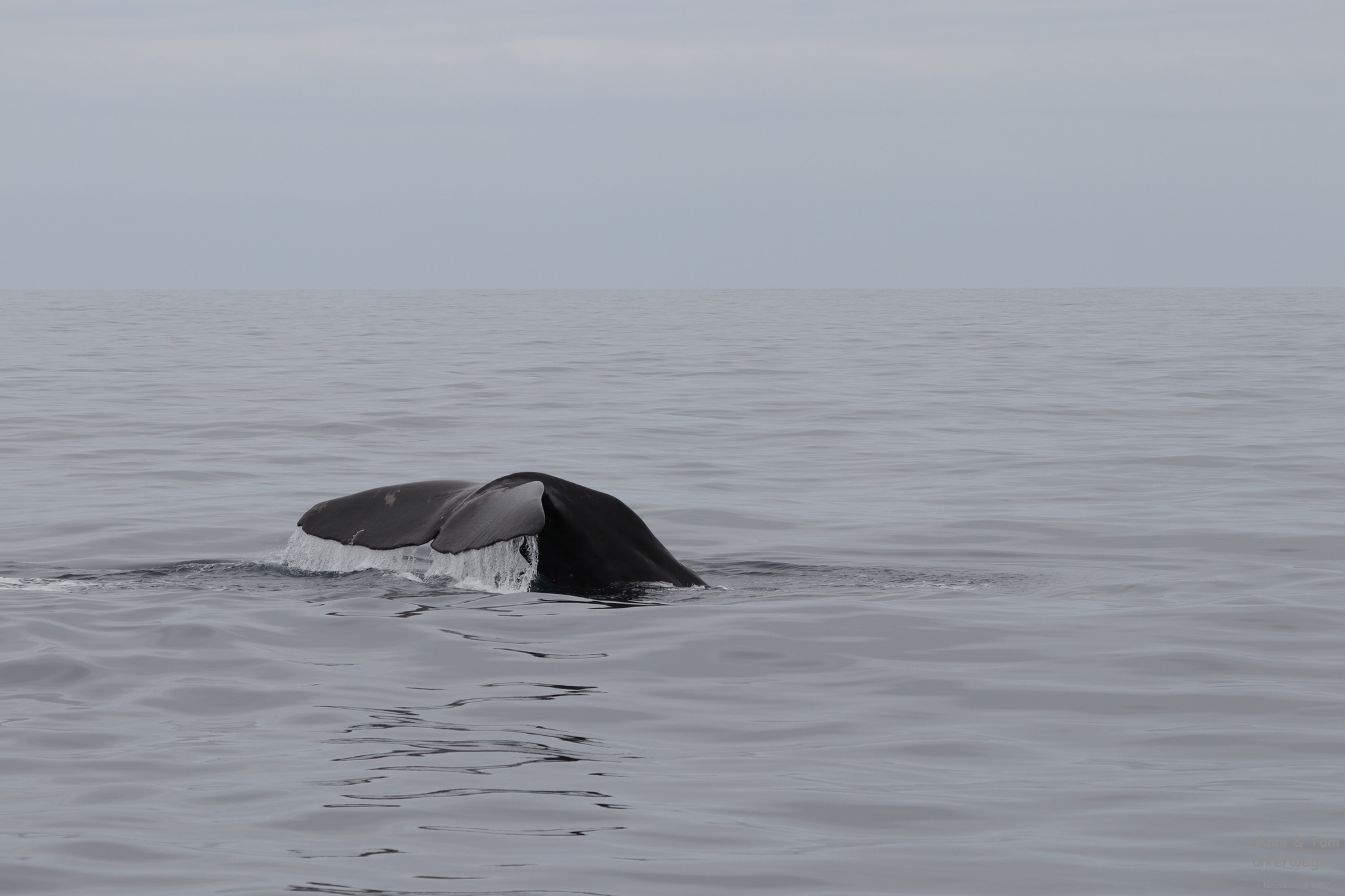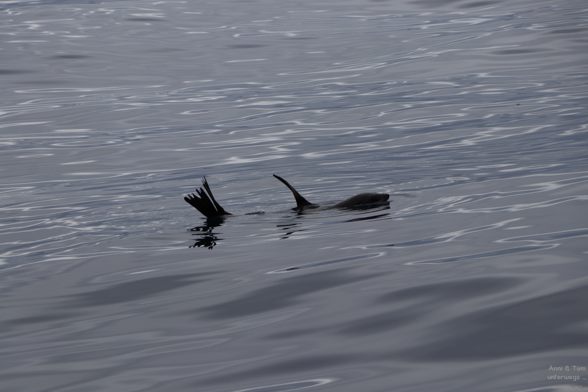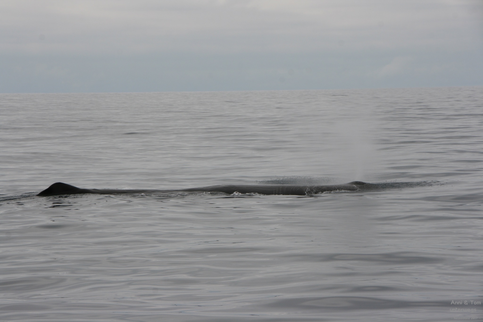 Nach langem Suchen, auch mit einem Hydrophon, können wir nach fast zwei Stunden einen Pottwal beim Auftauchen und Luftholen beobachten. Er blieb etwas mehr als fünf Minuten an der Wasseroberfläche, bis er schließlich wieder abtauchte und wir noch seine Schwanzflosse sehen konnten :-)